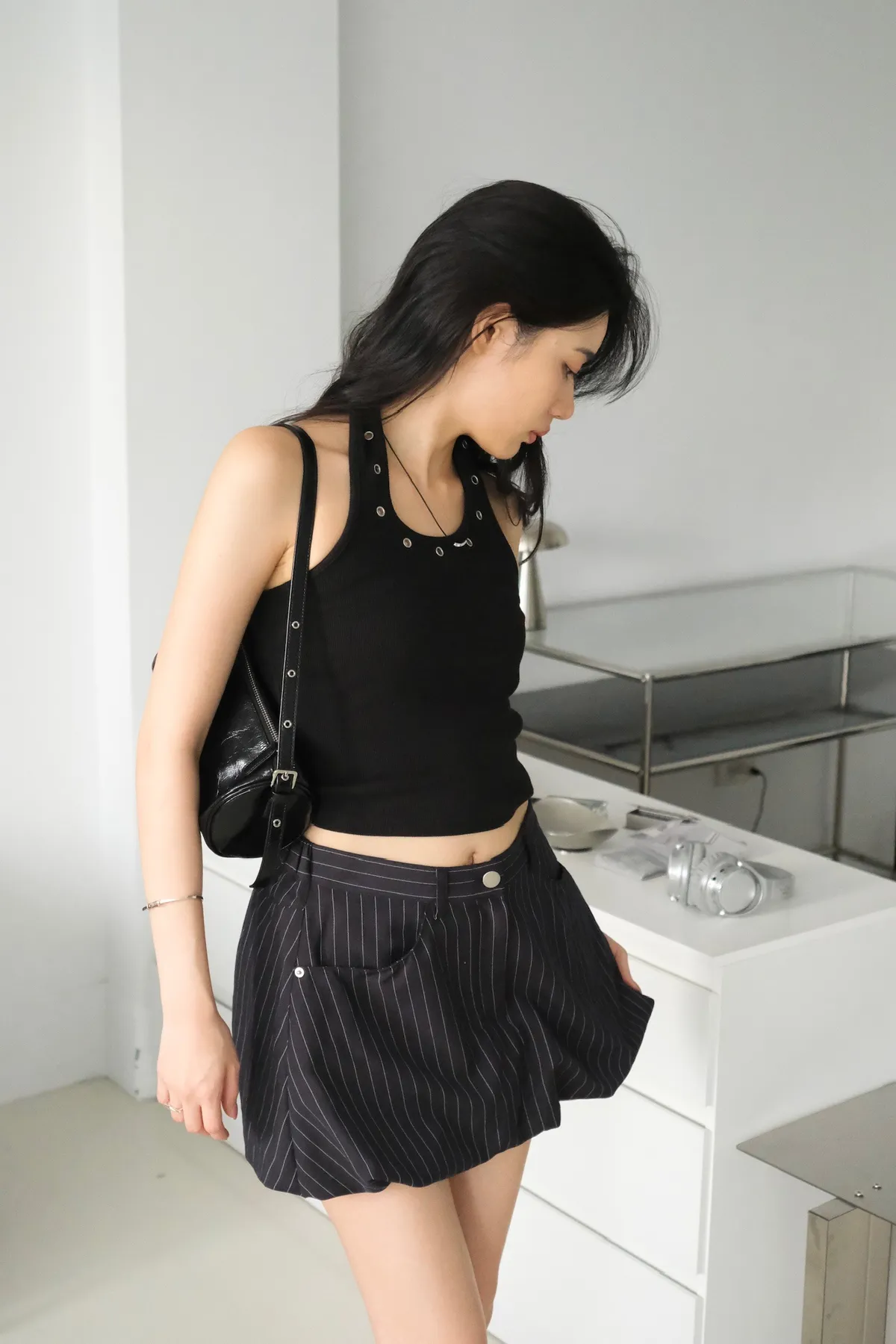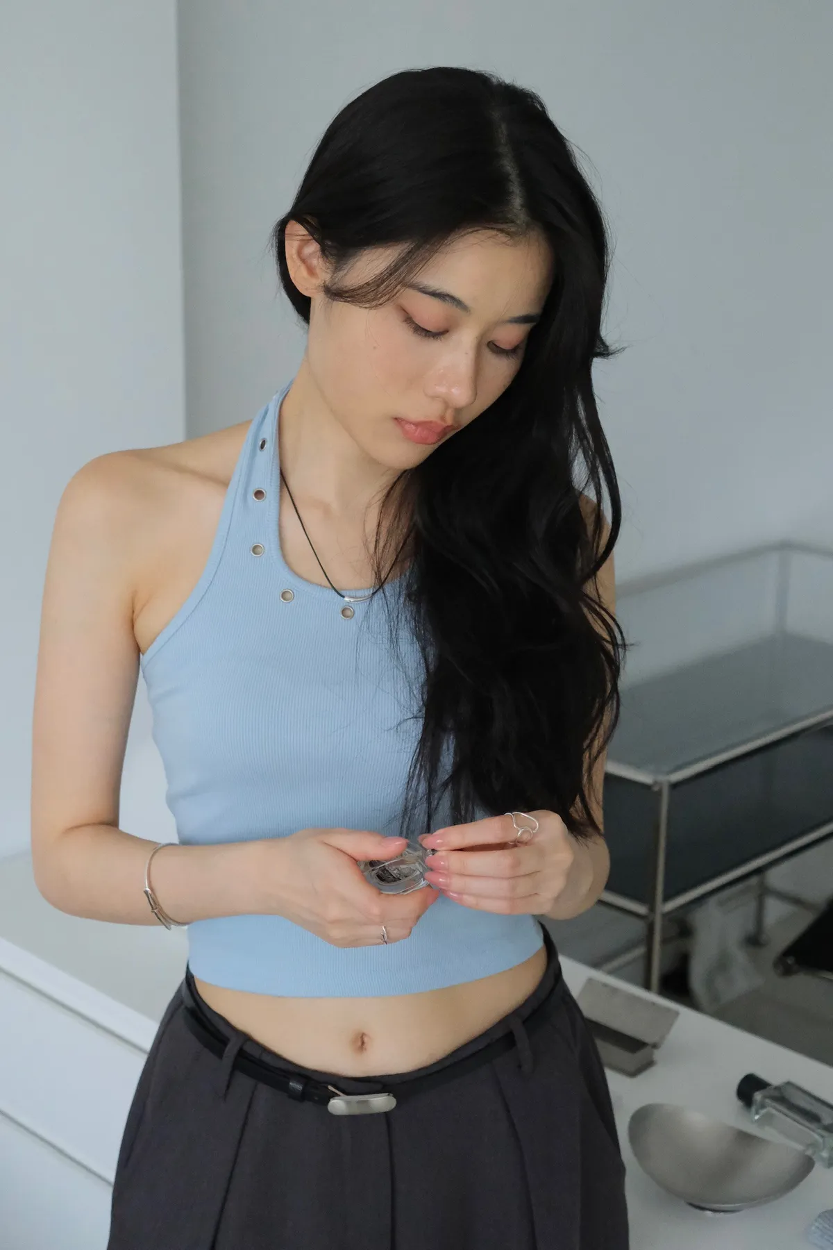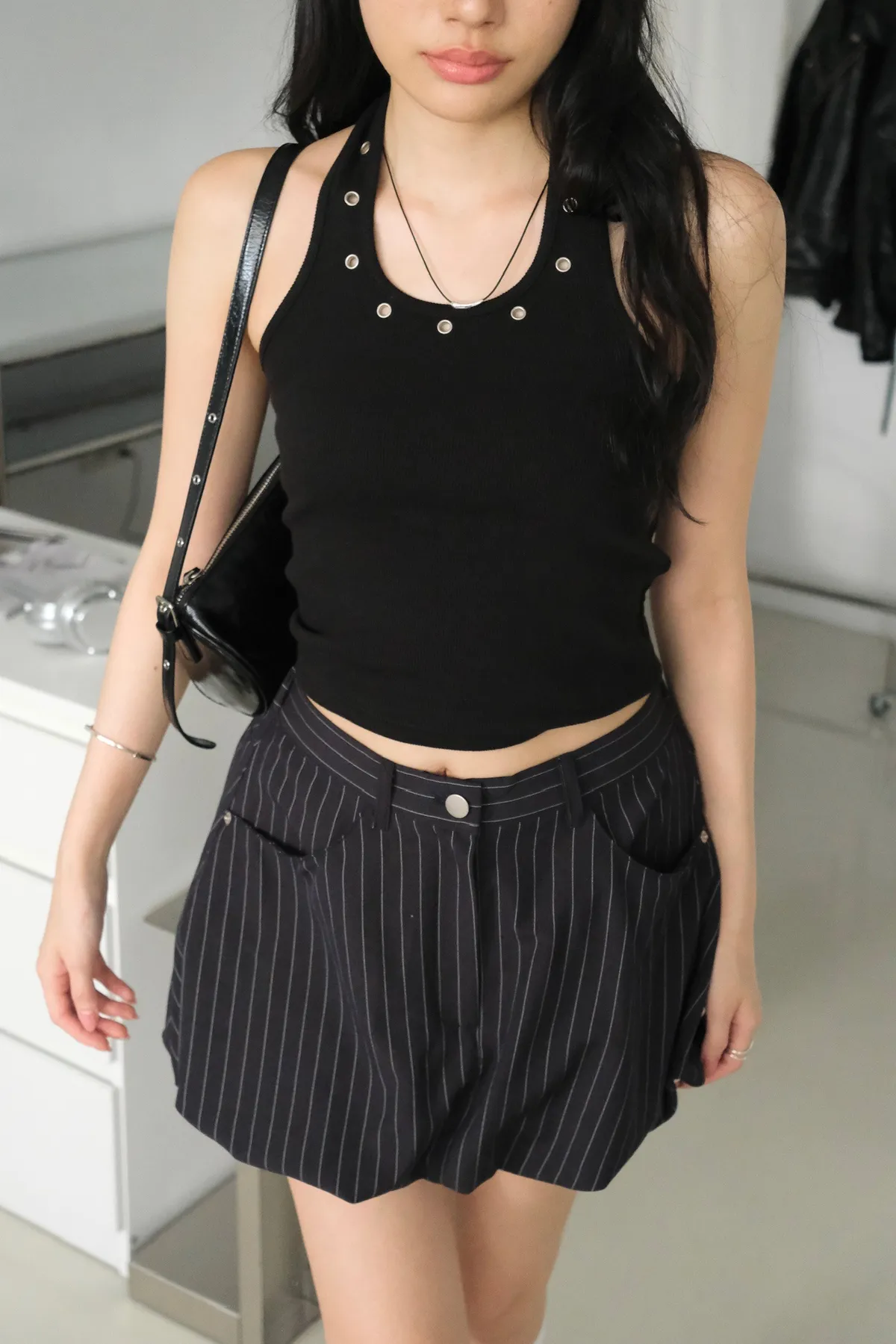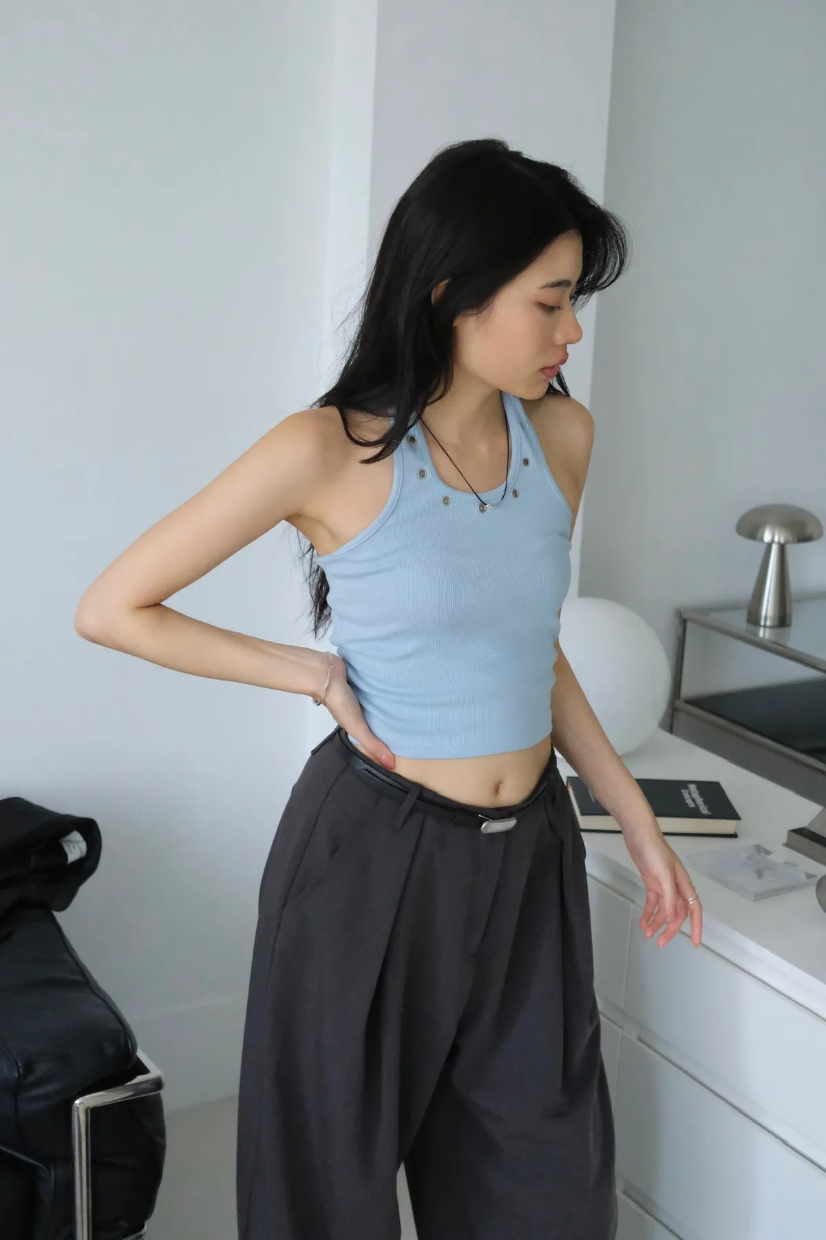 領口拼接金屬銀扣環細節