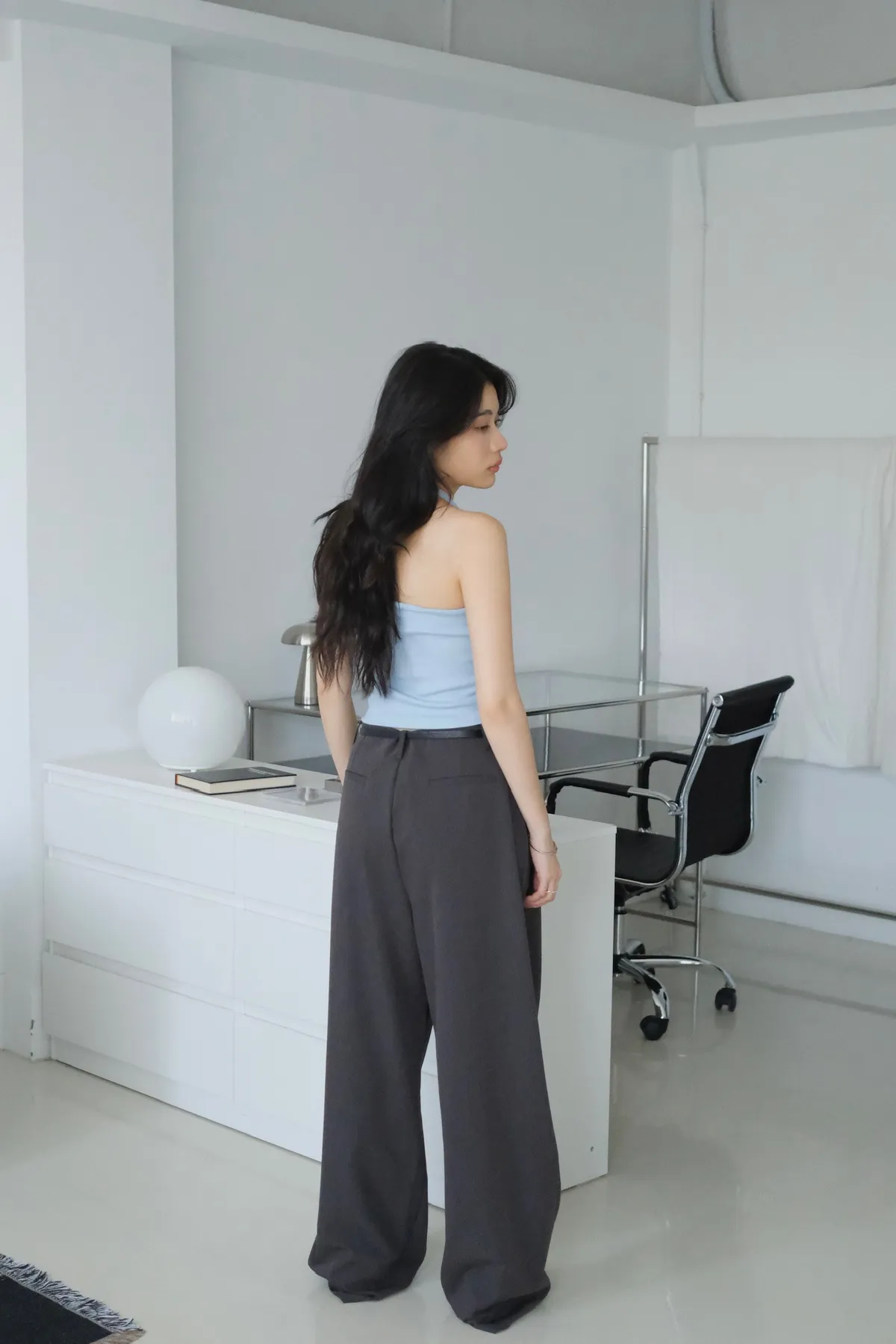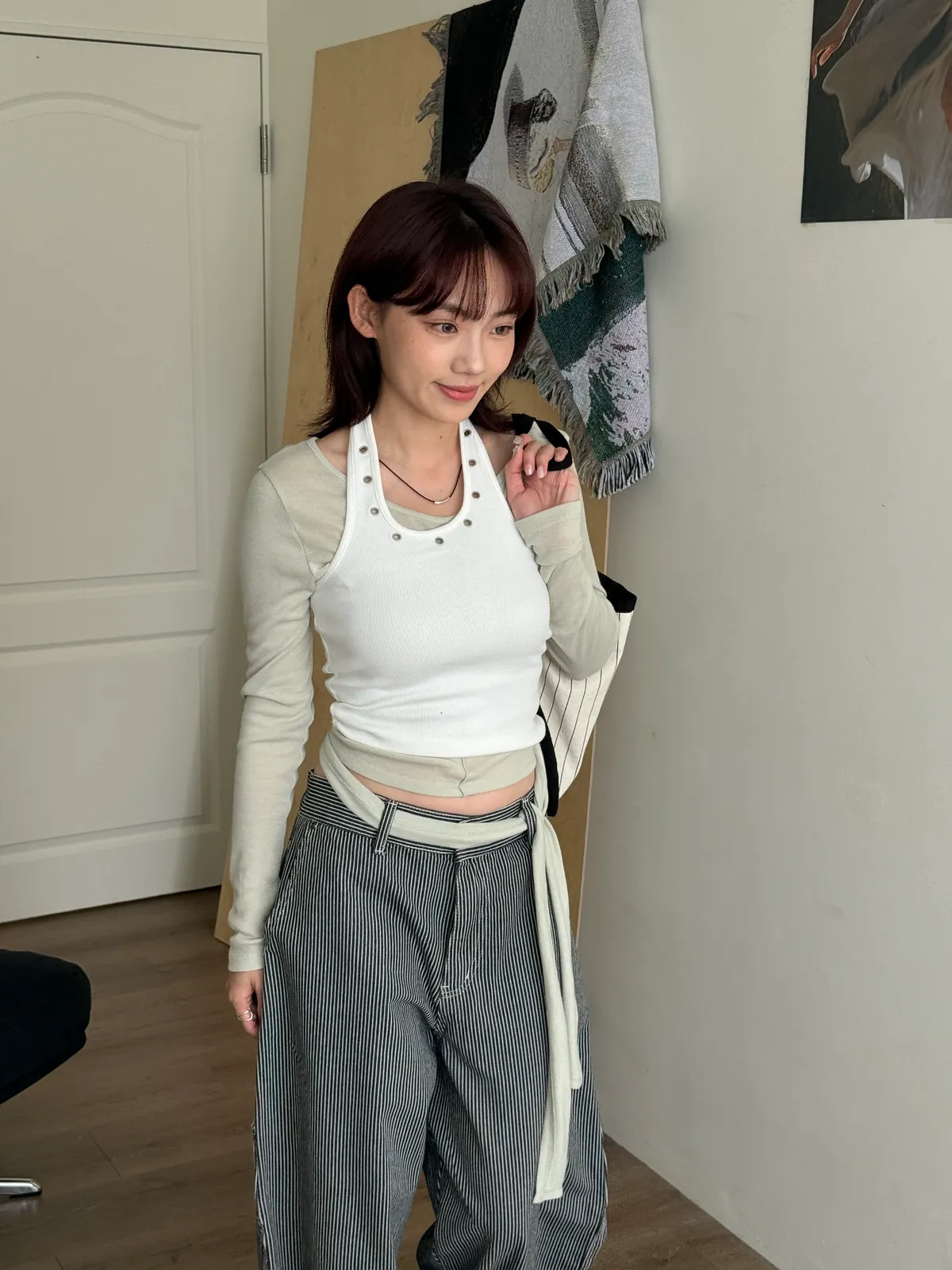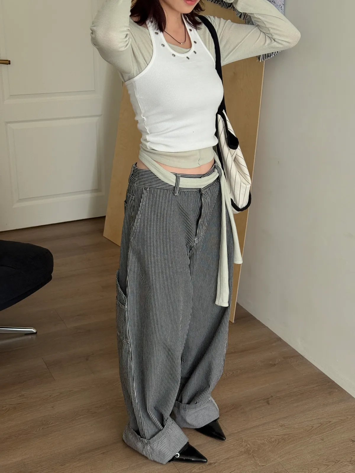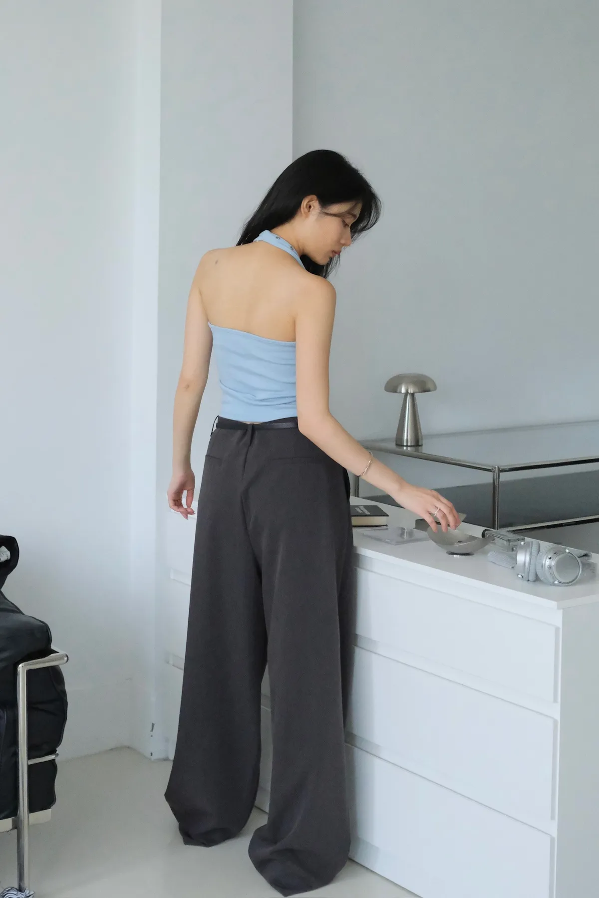 領口拼接金屬銀扣環細節