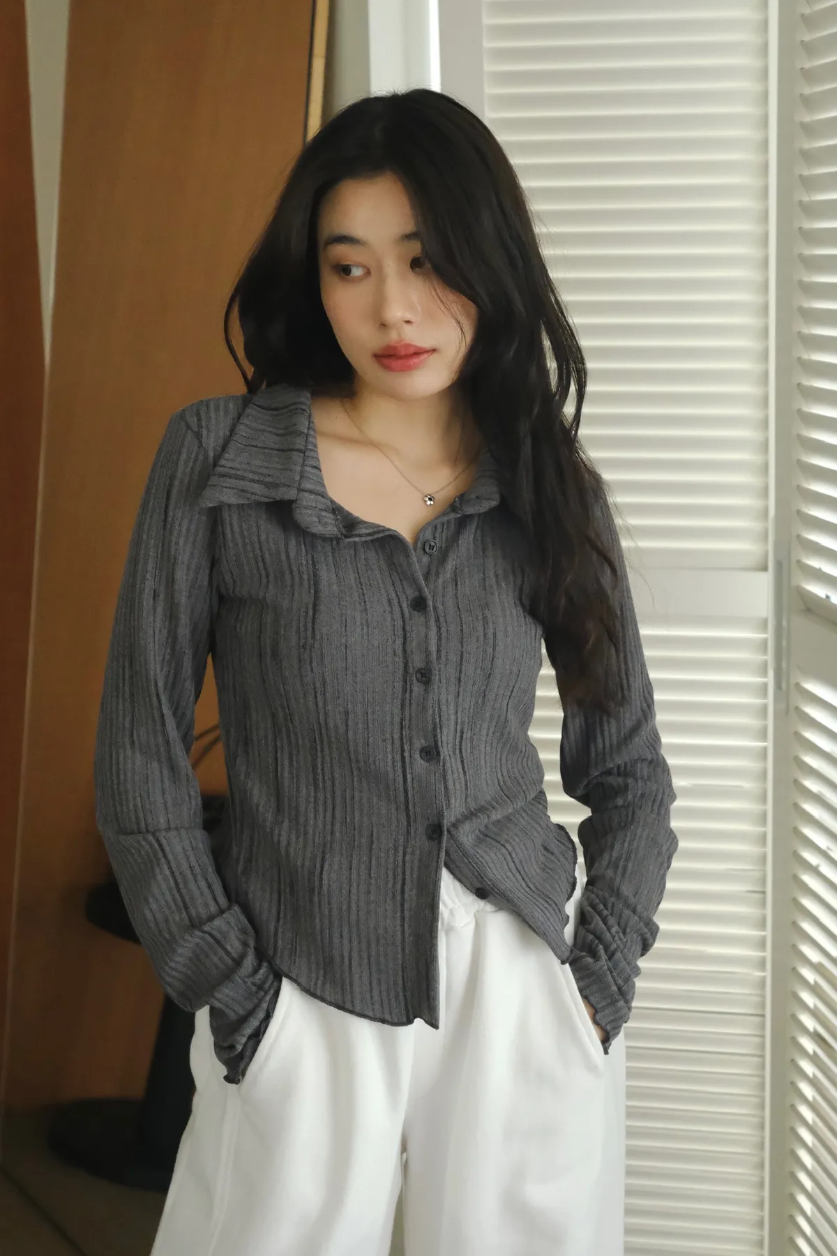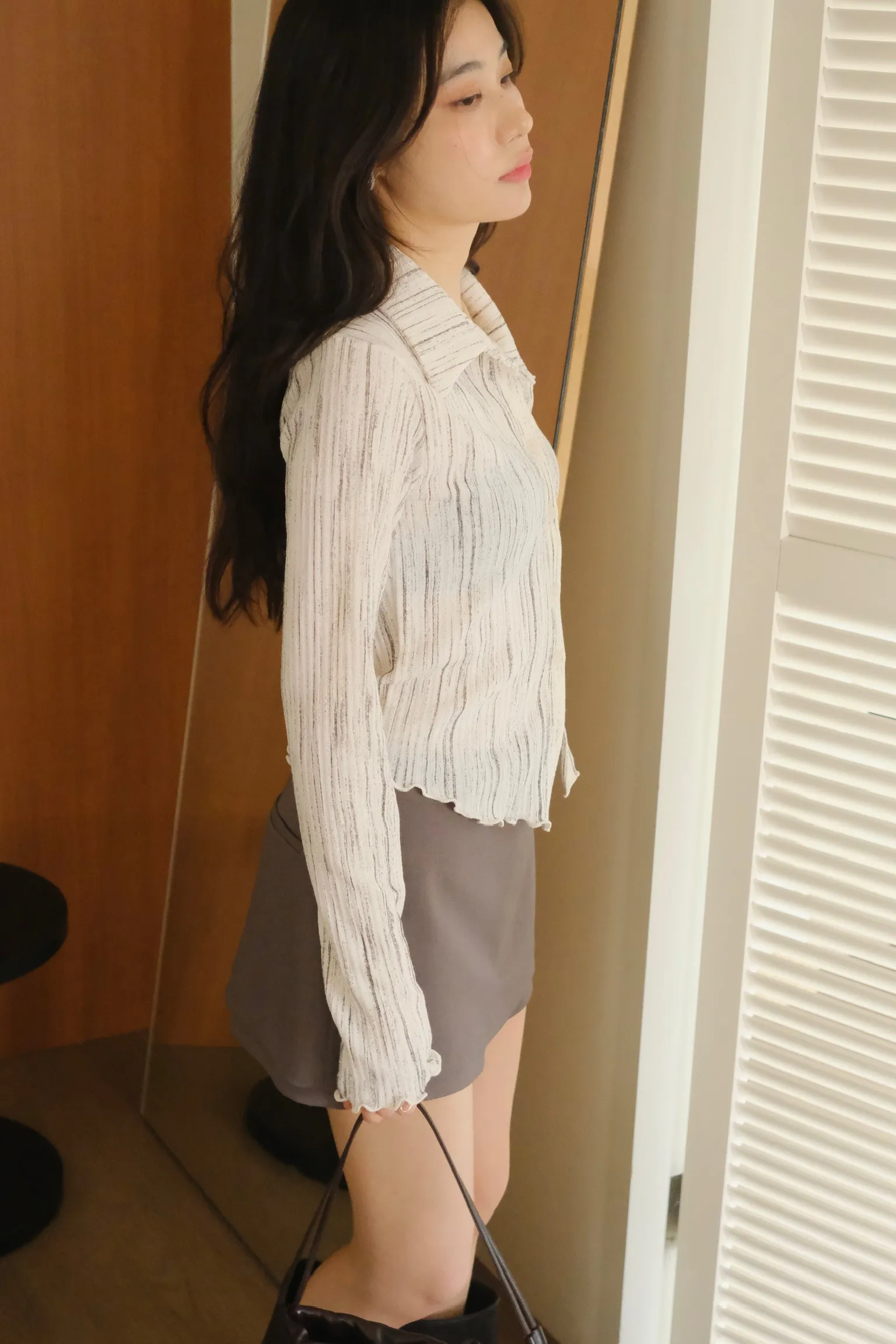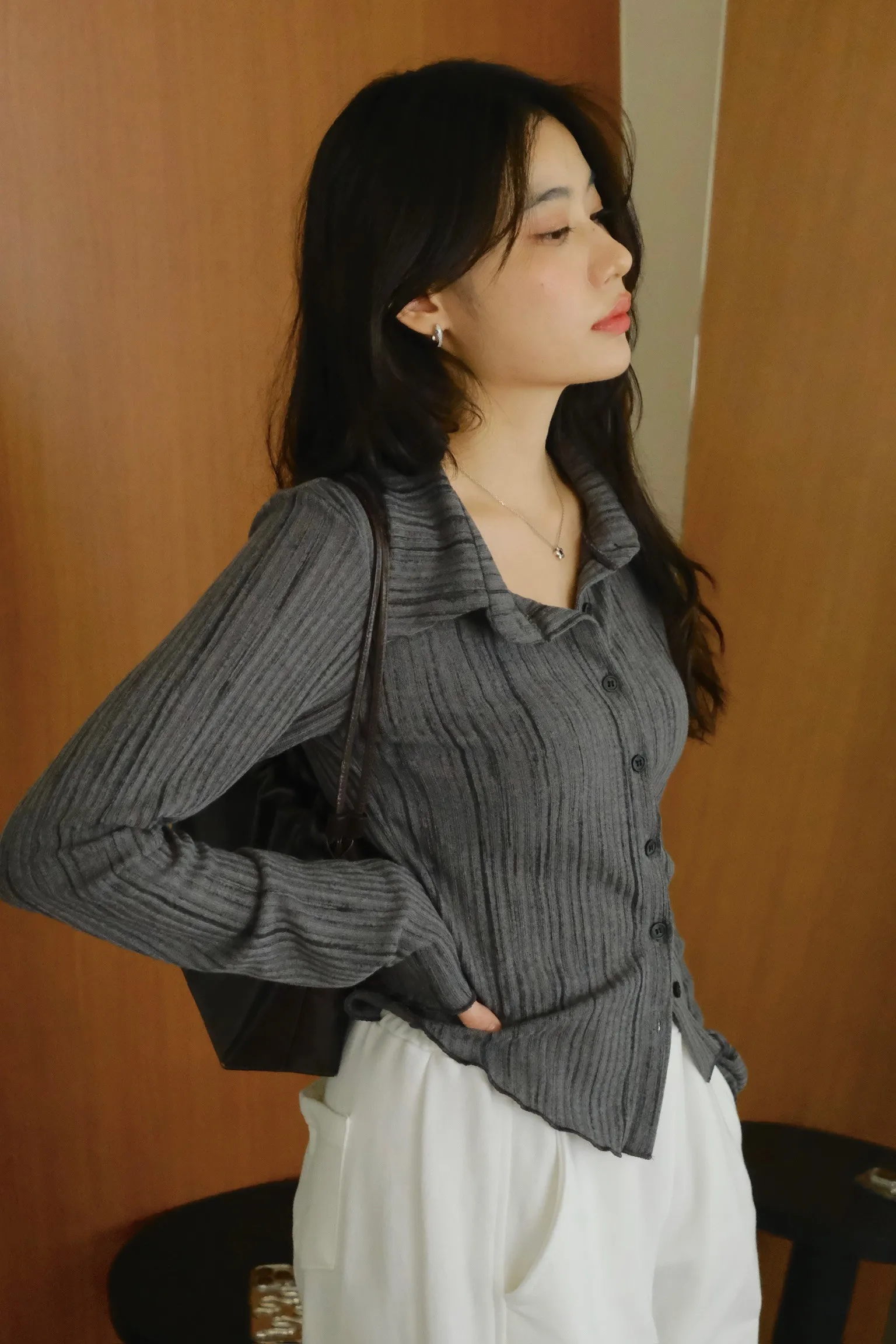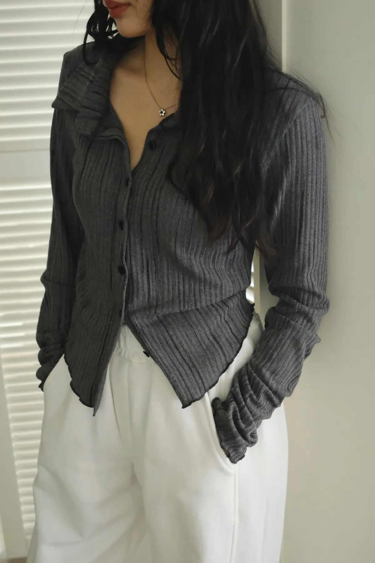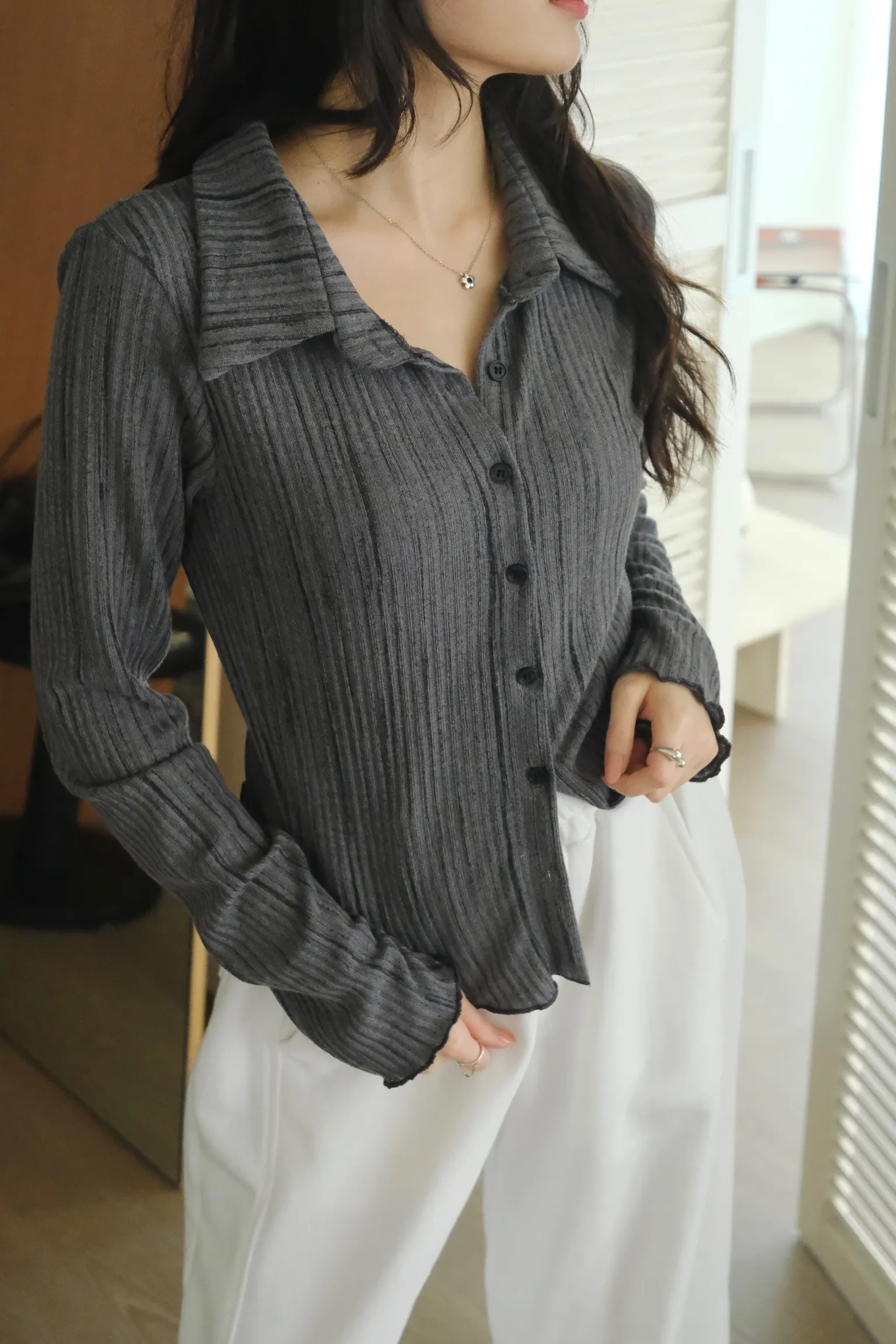 翻領設計搭配袖口下擺的木耳邊