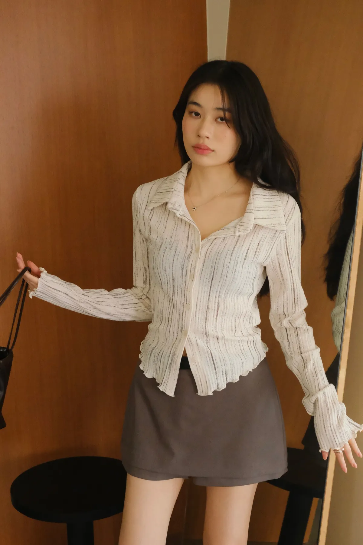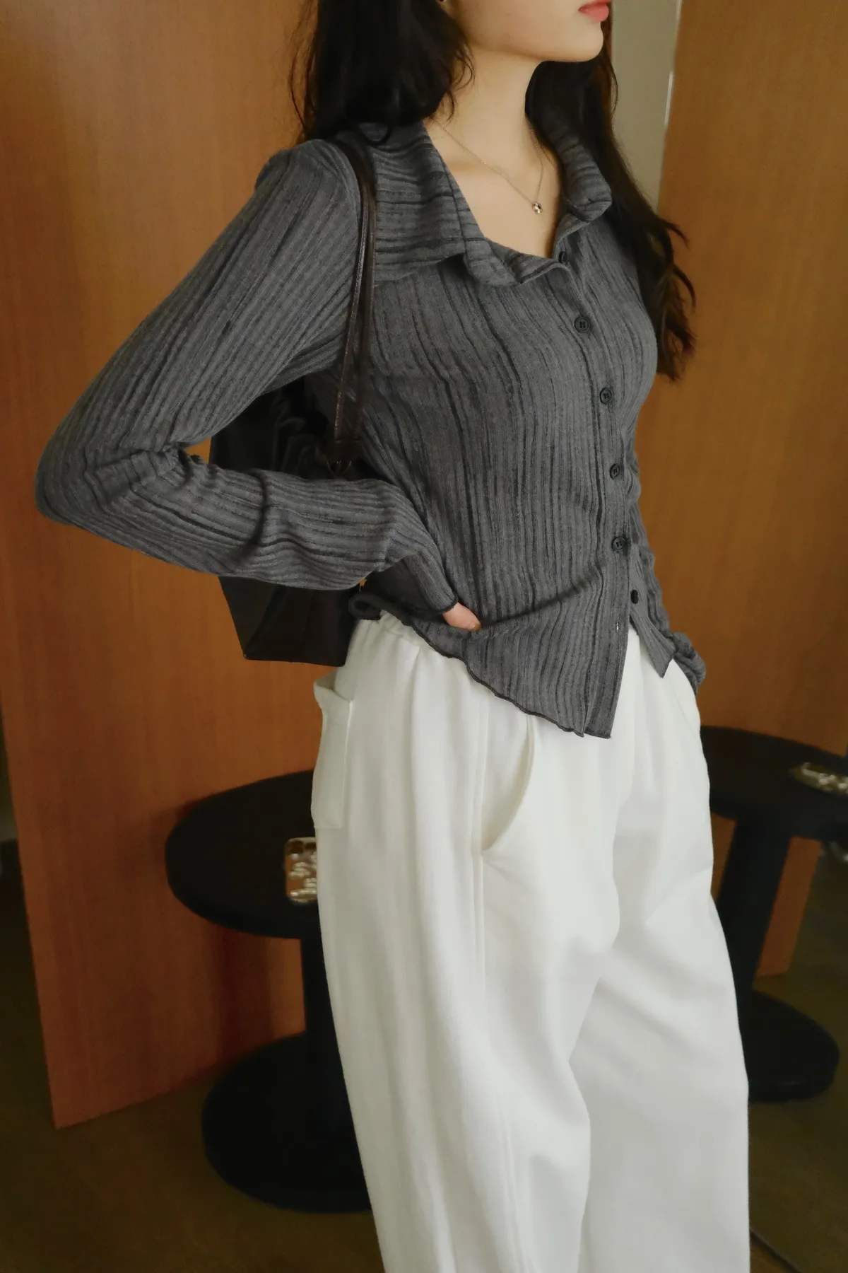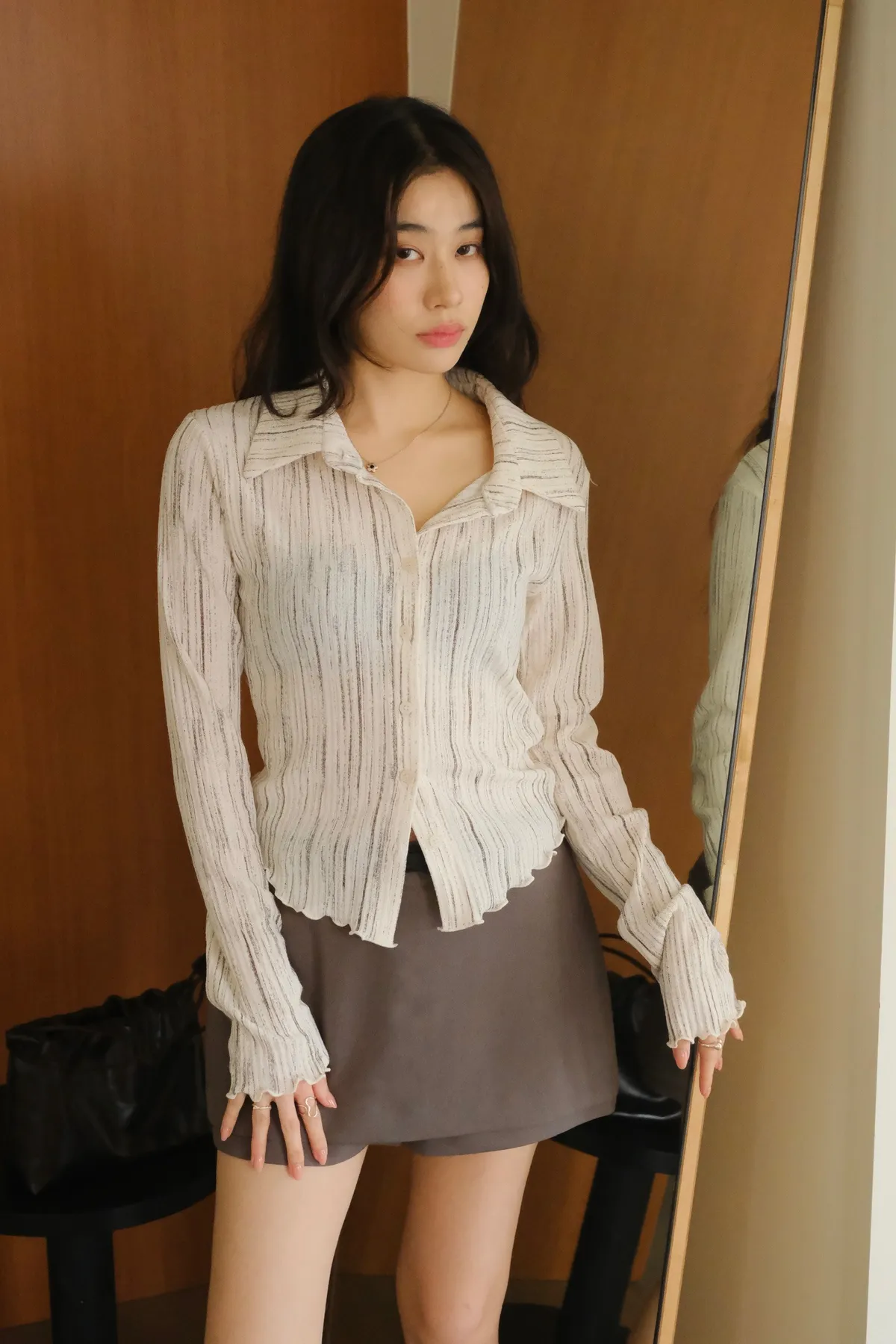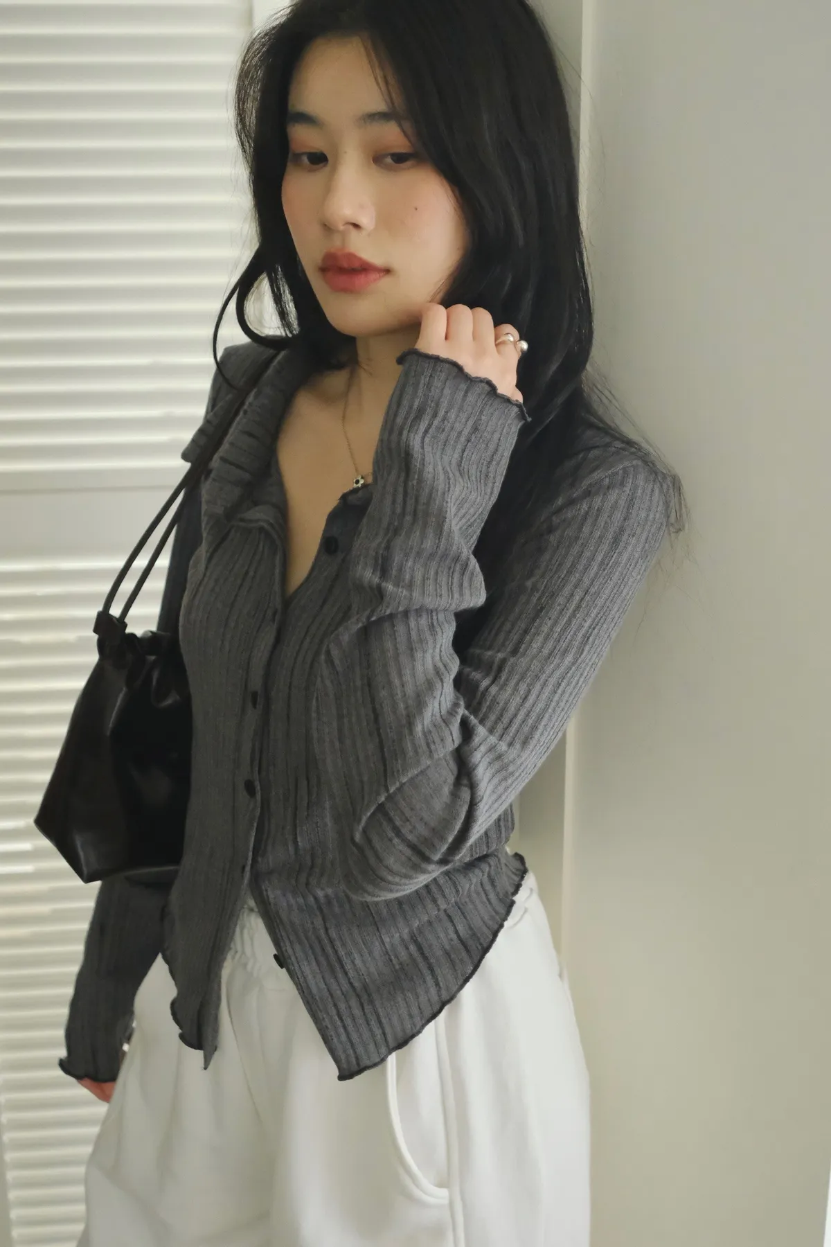 翻領設計搭配袖口下擺的木耳邊