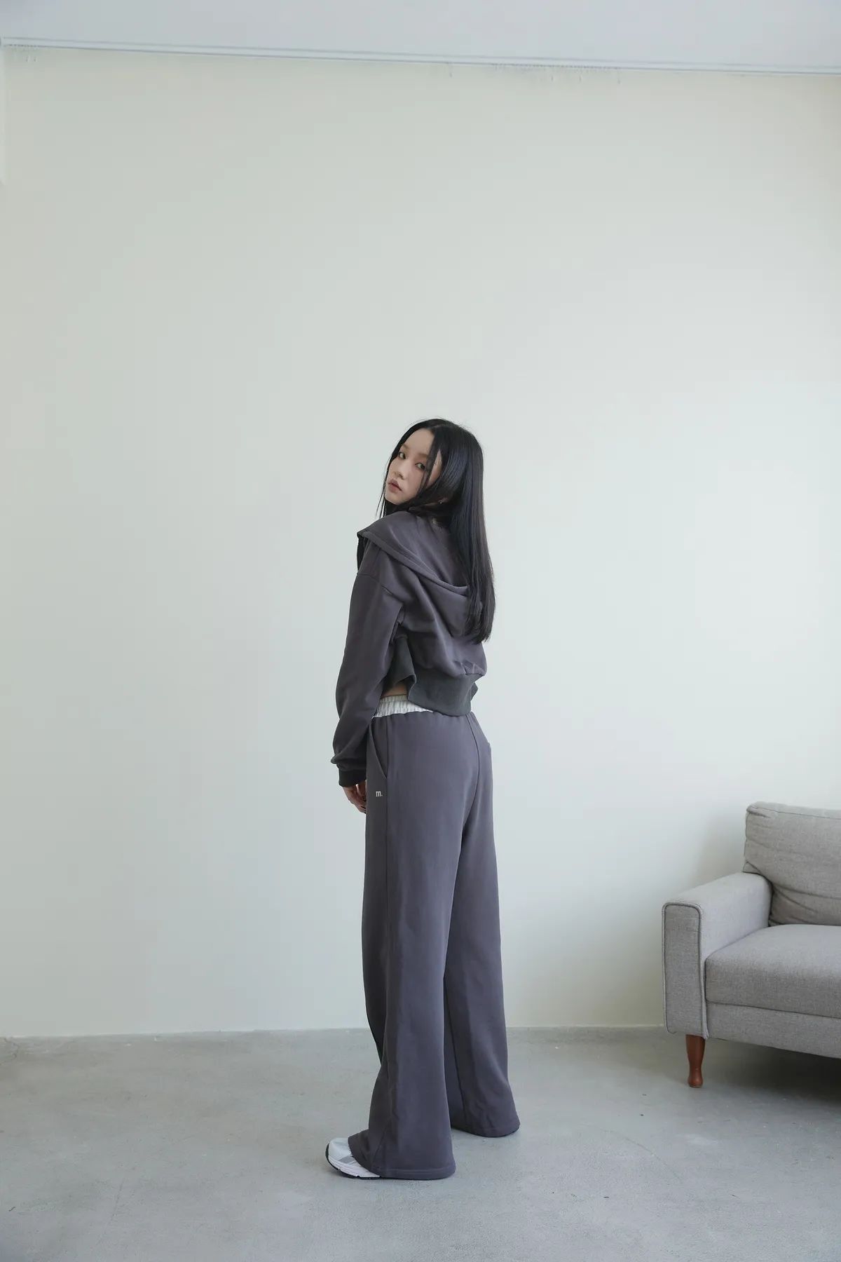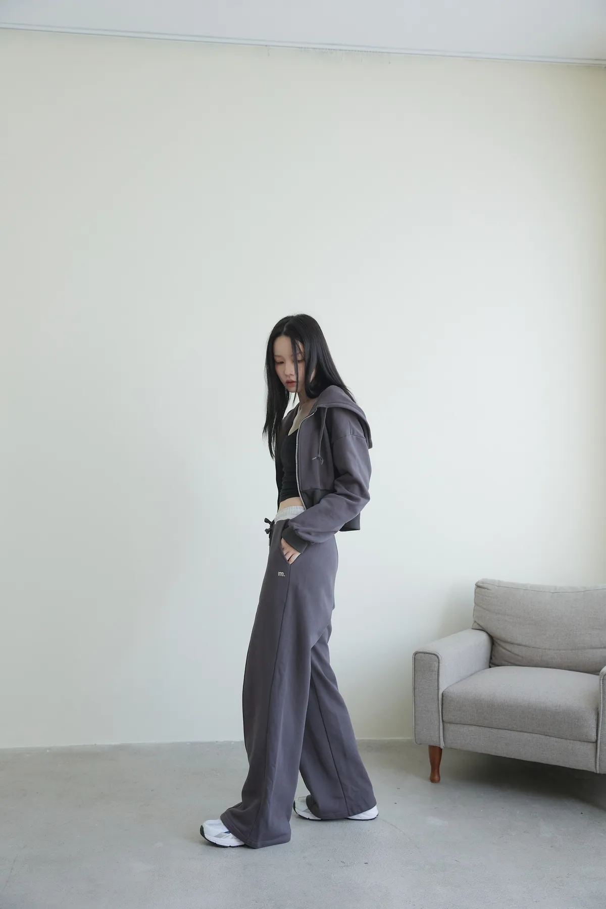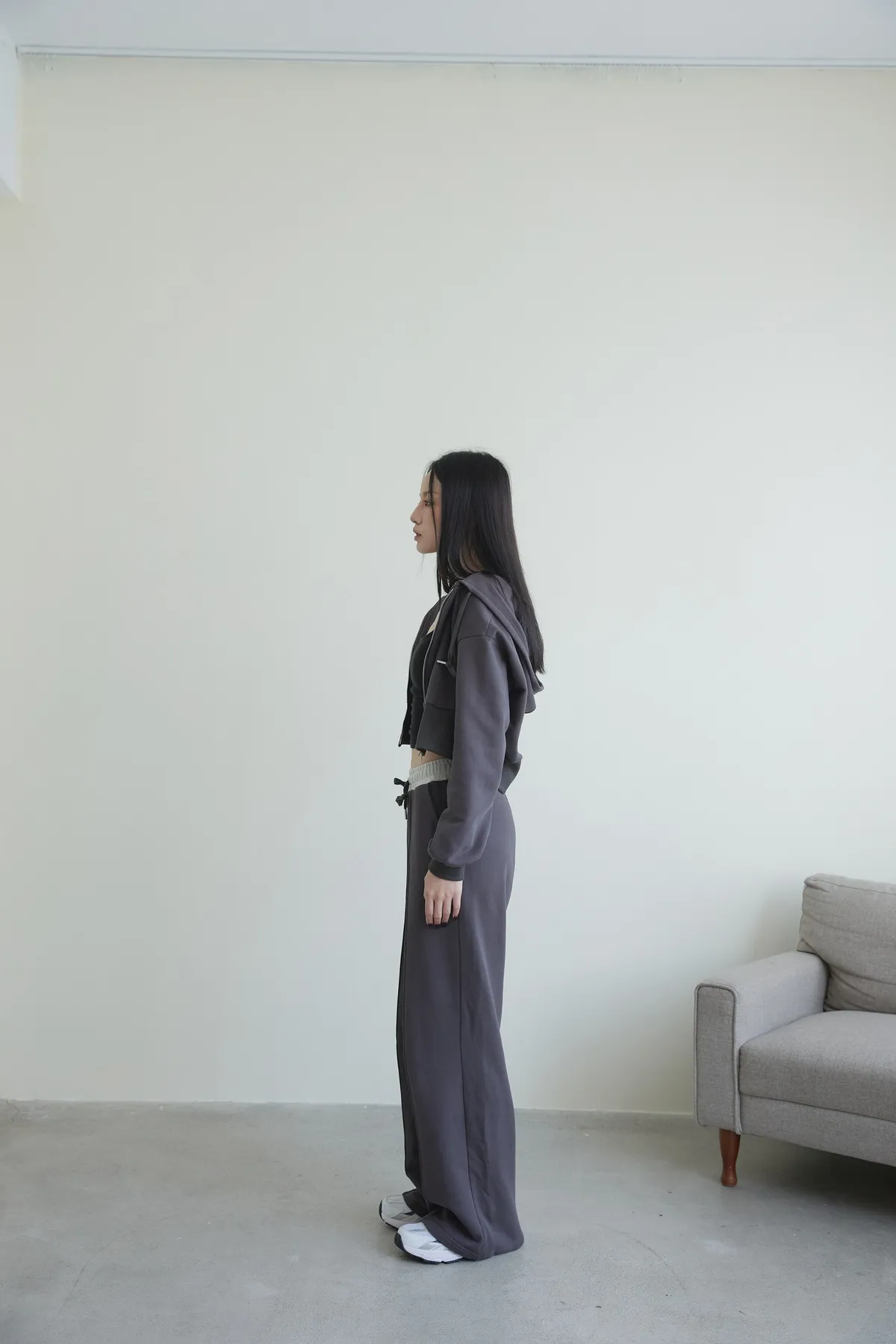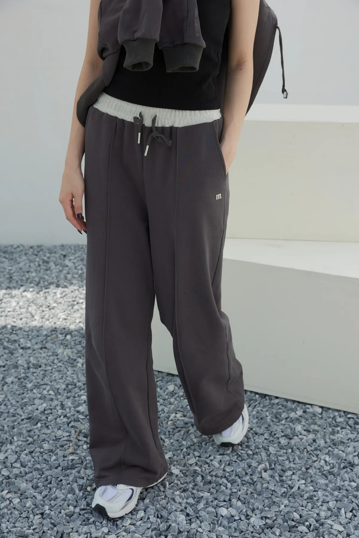 褲身中立體車線搭配落地長度設計