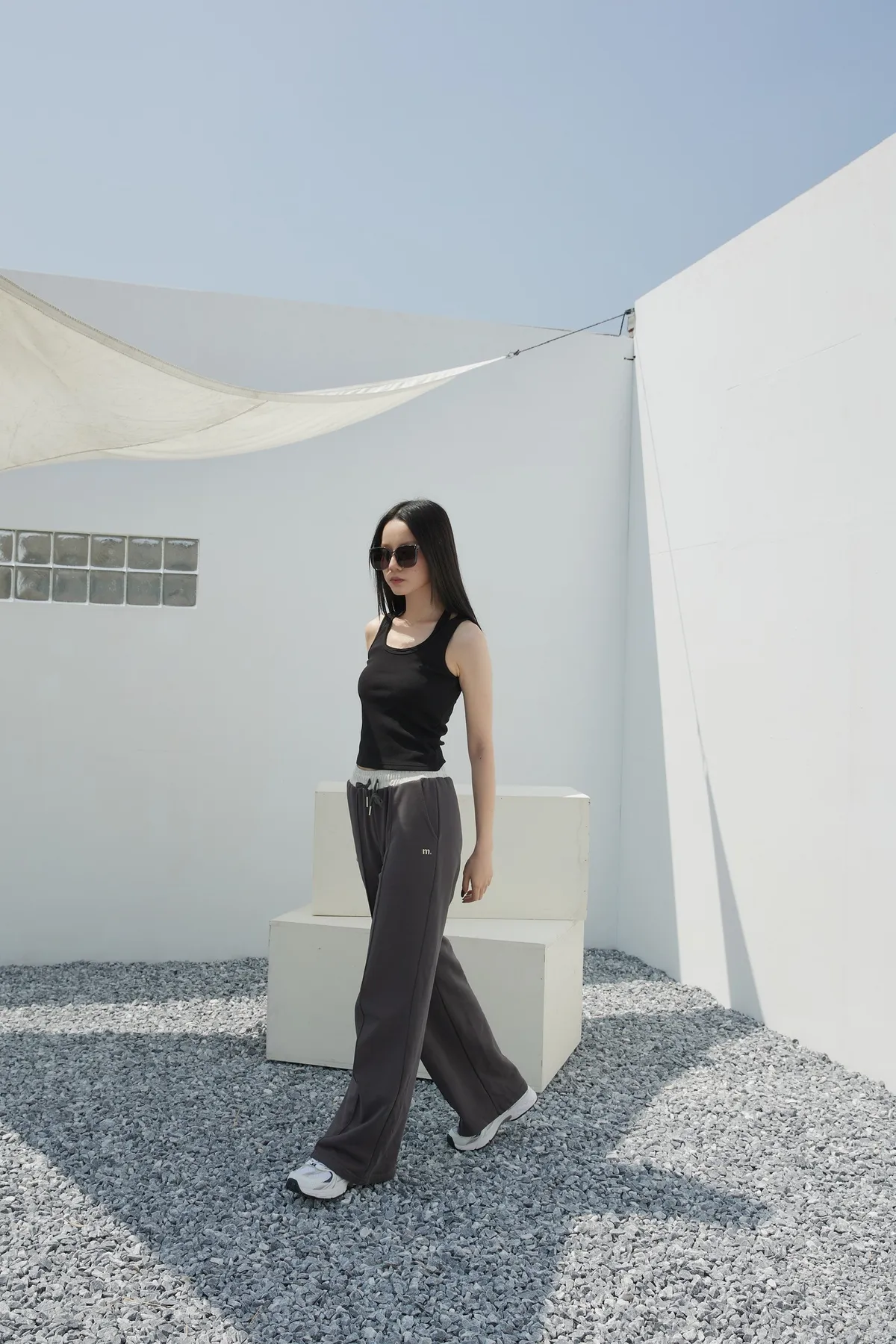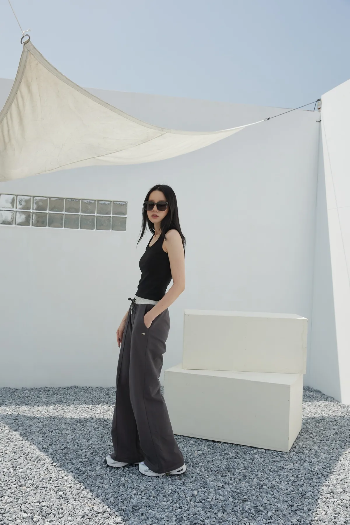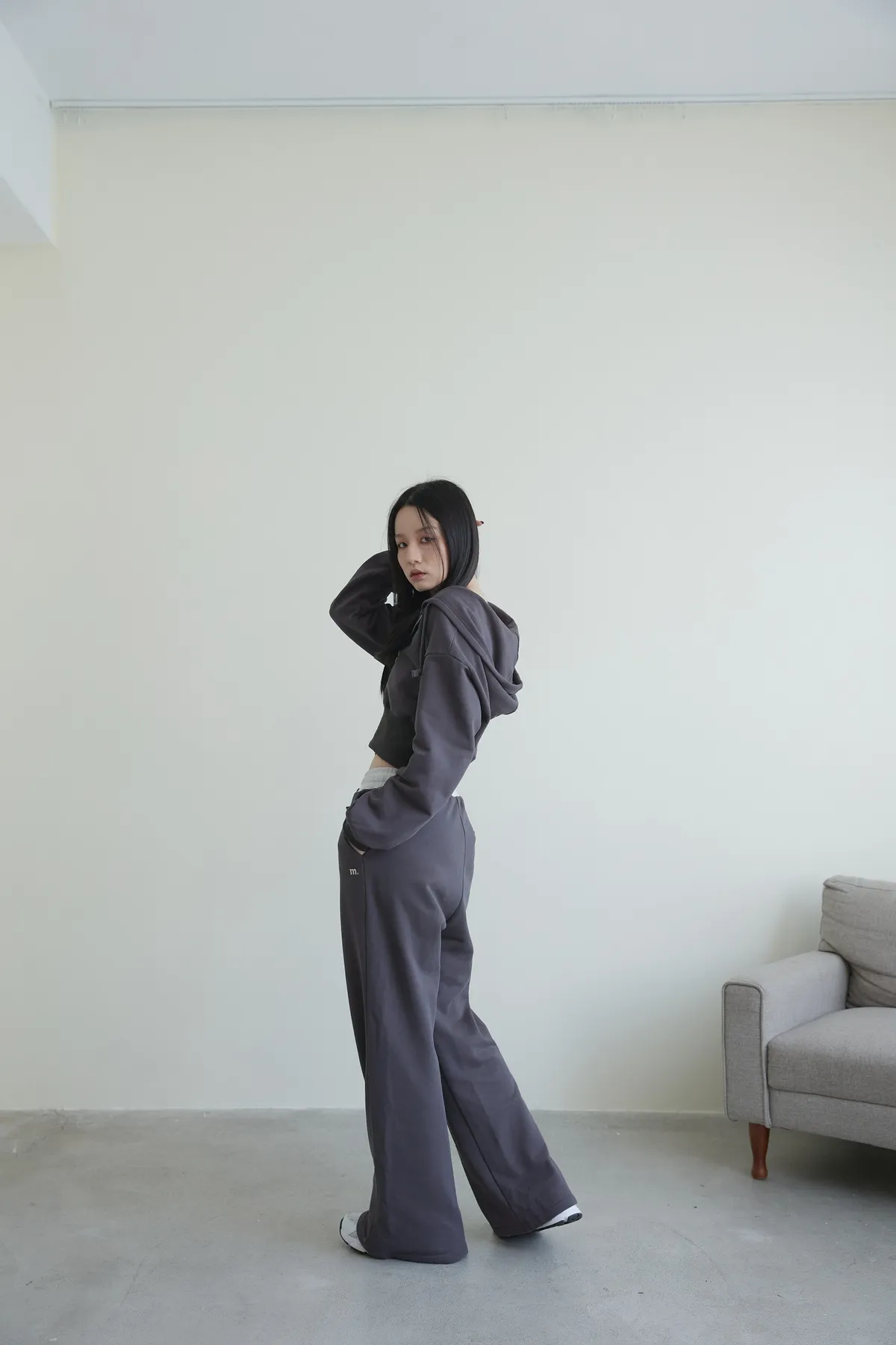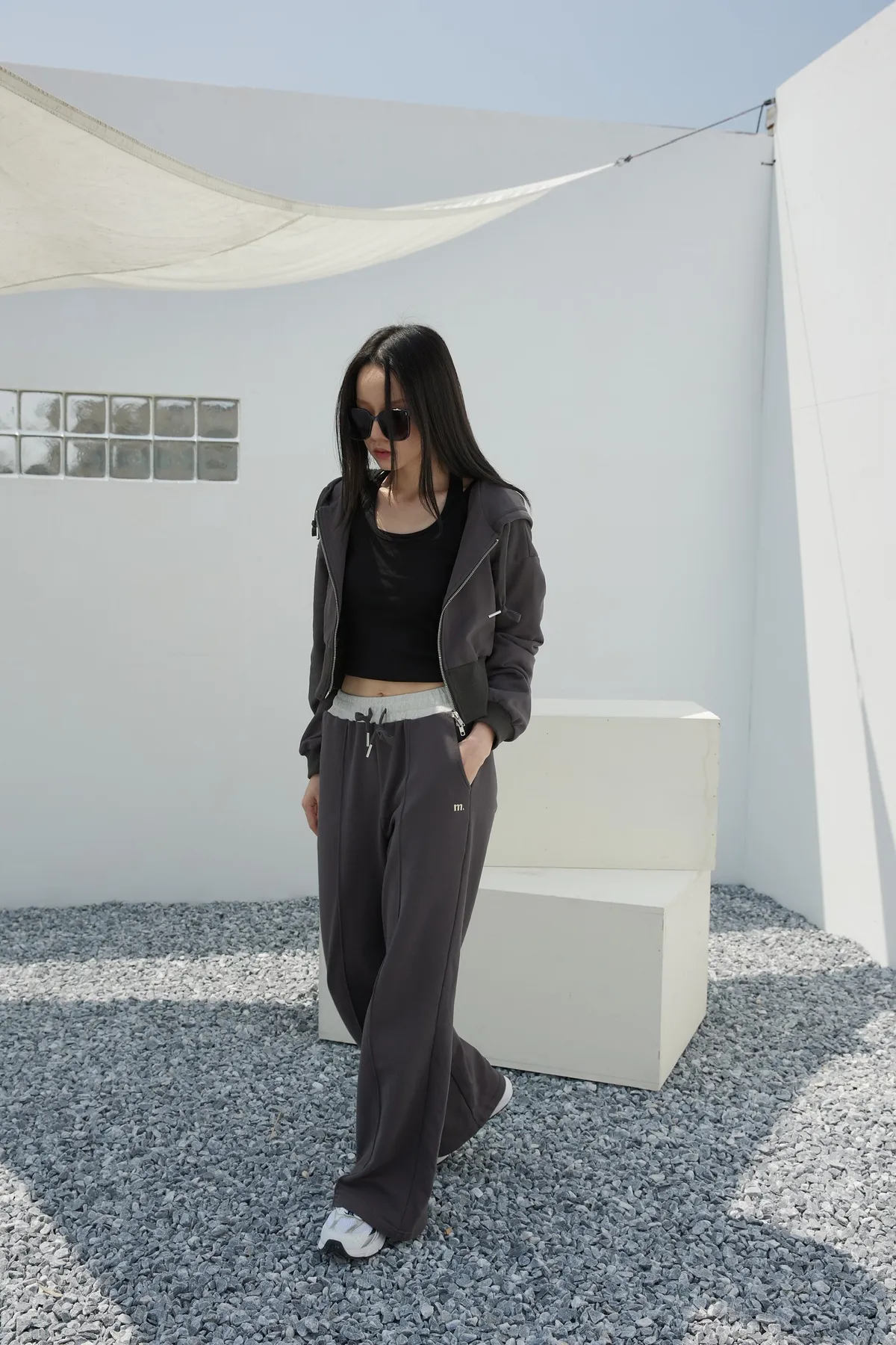 褲身中立體車線搭配落地長度設計