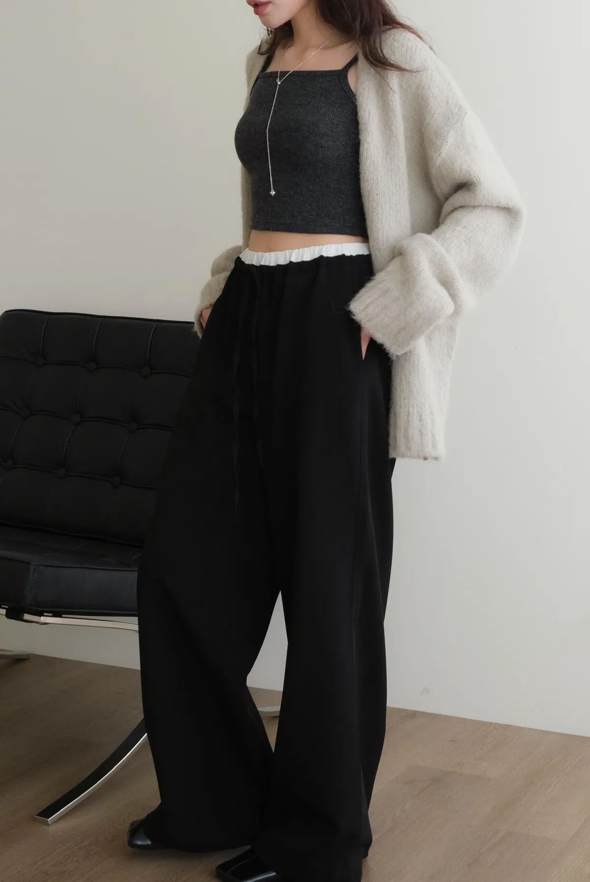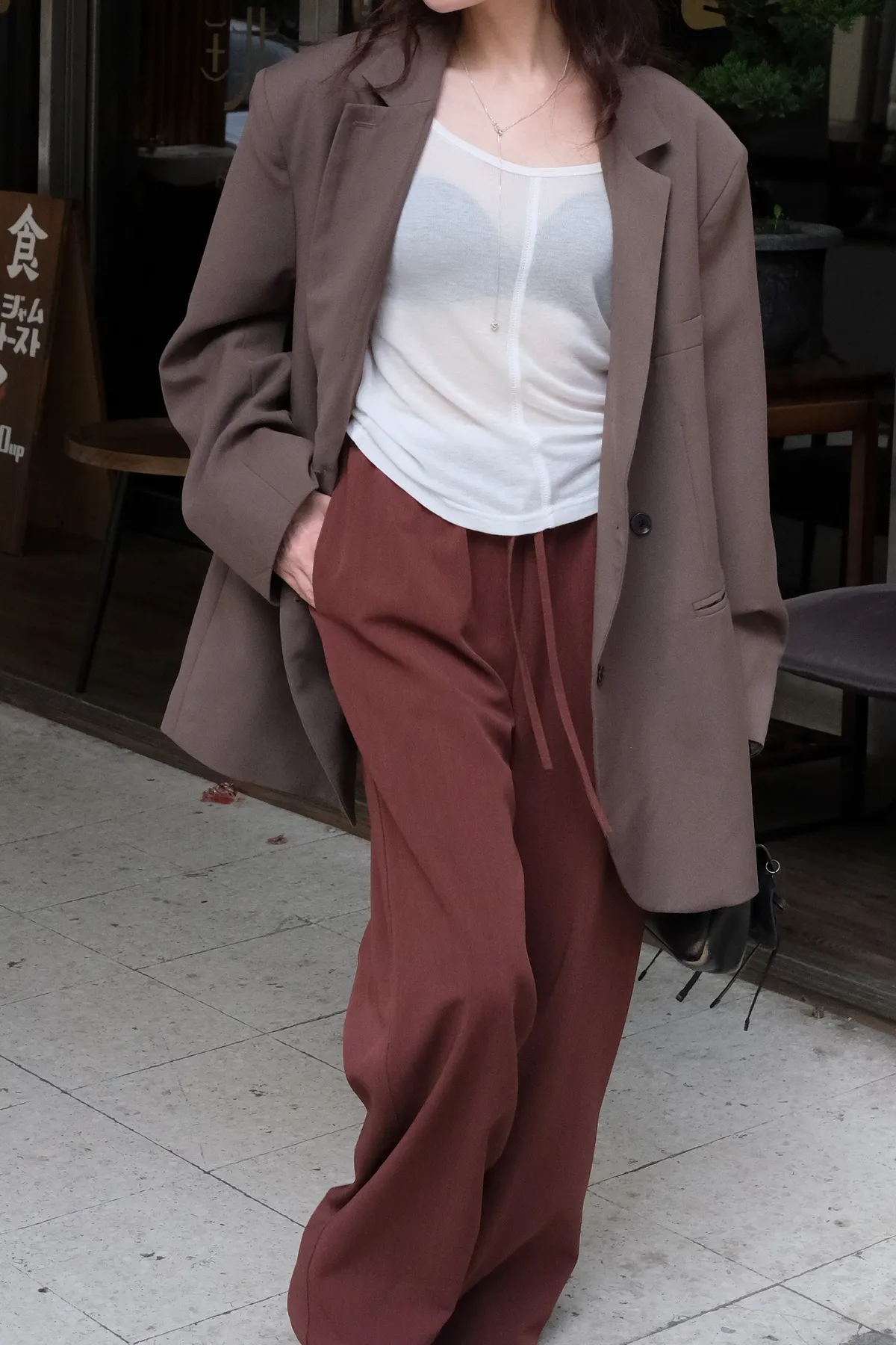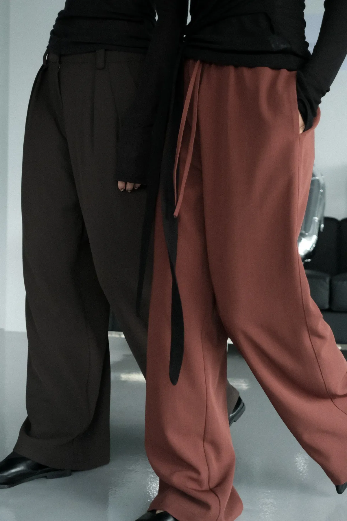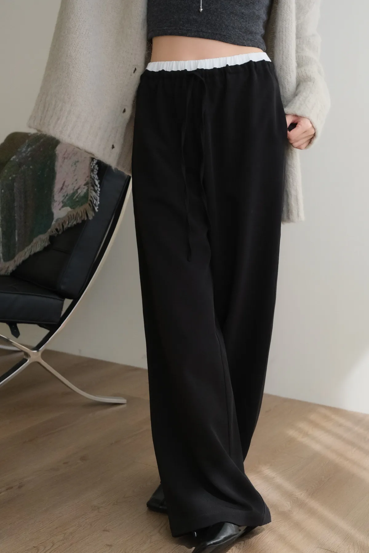雙層褲頭搭配抽繩設計並採用西裝布面料
