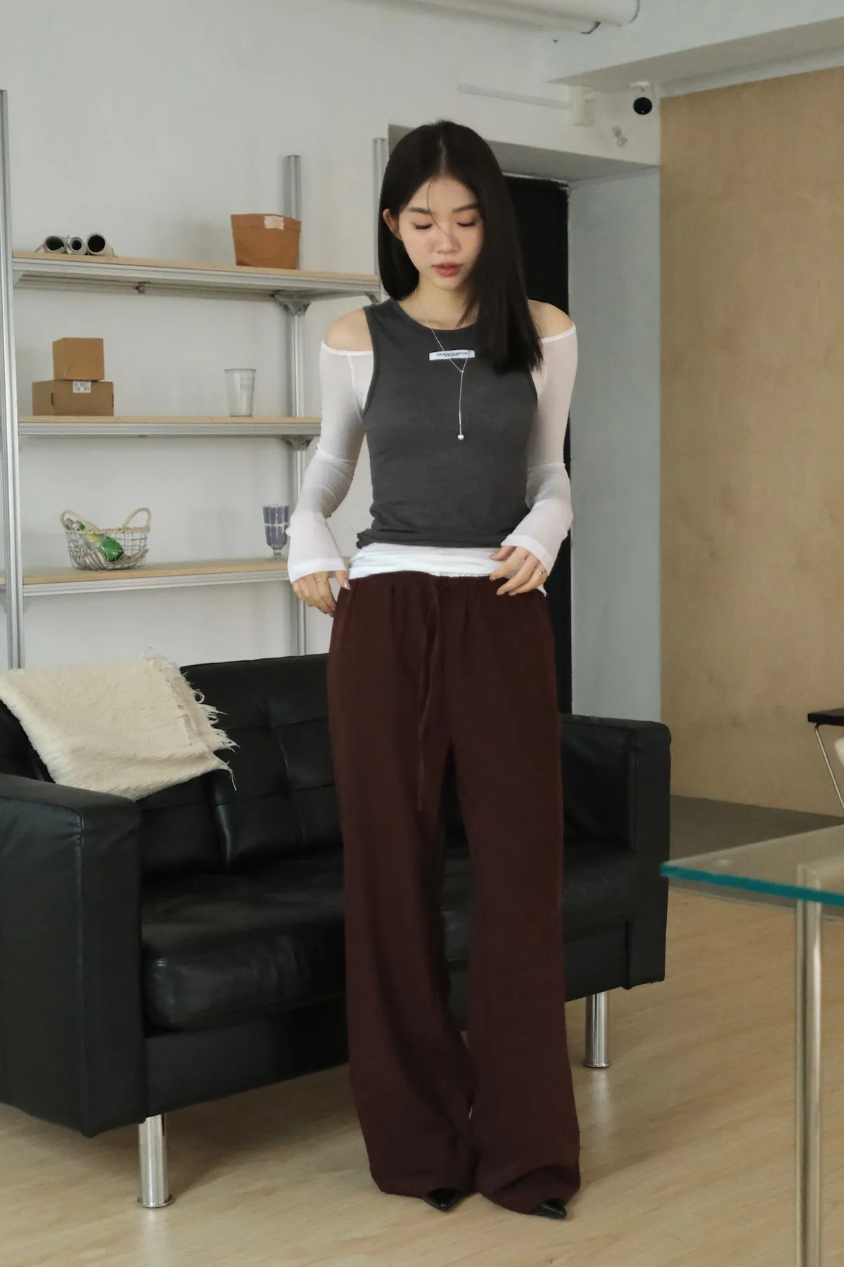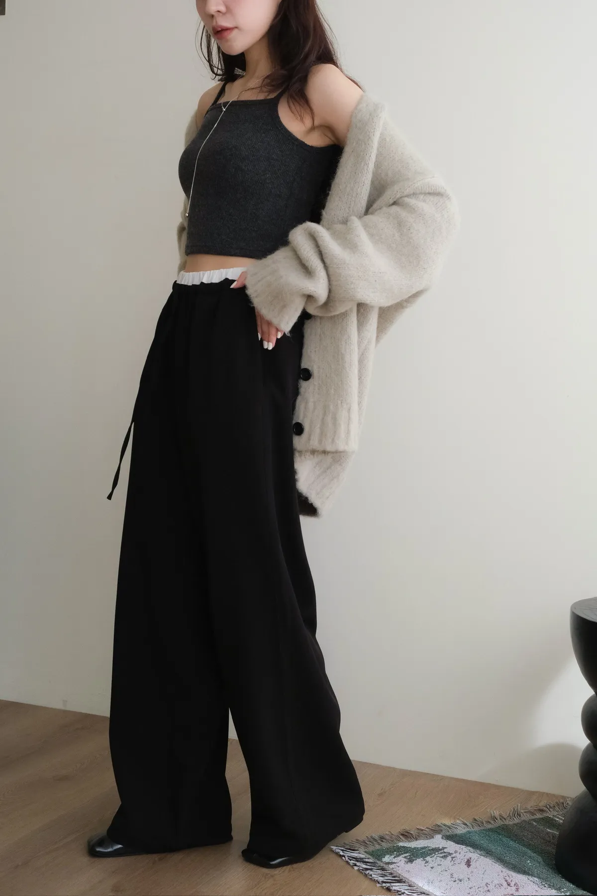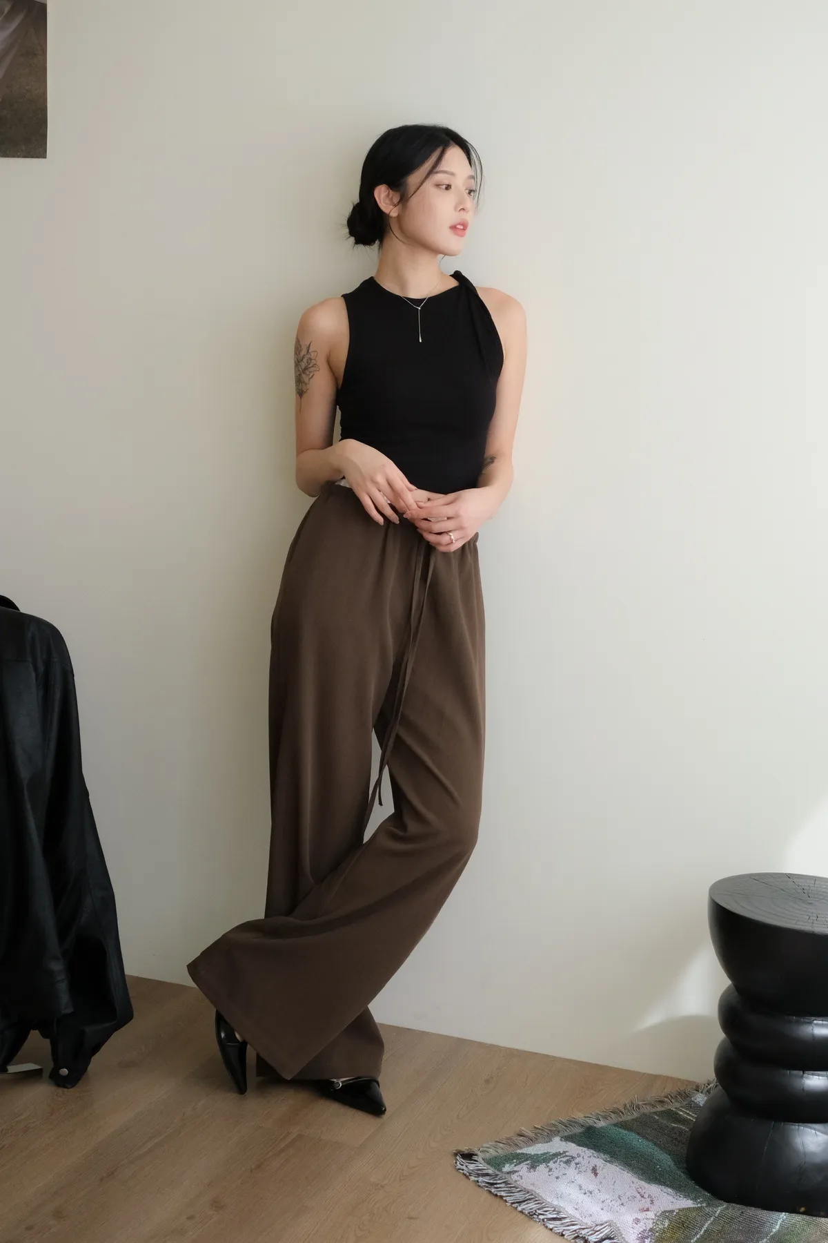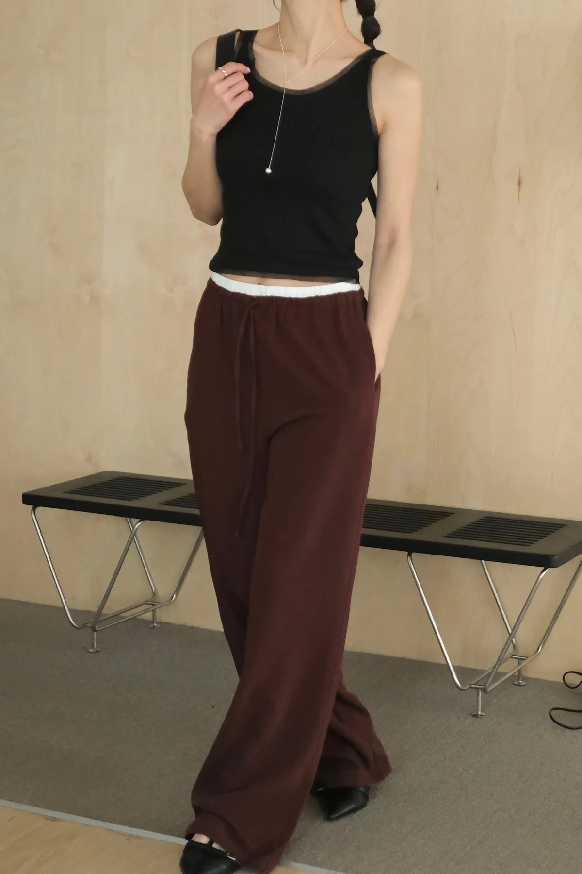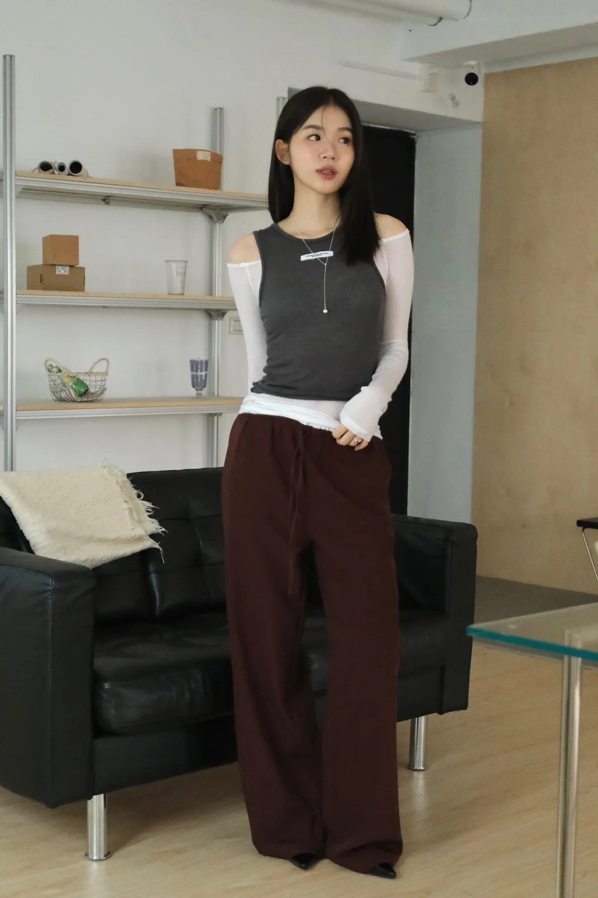 雙層褲頭搭配抽繩設計並採用西裝布面料