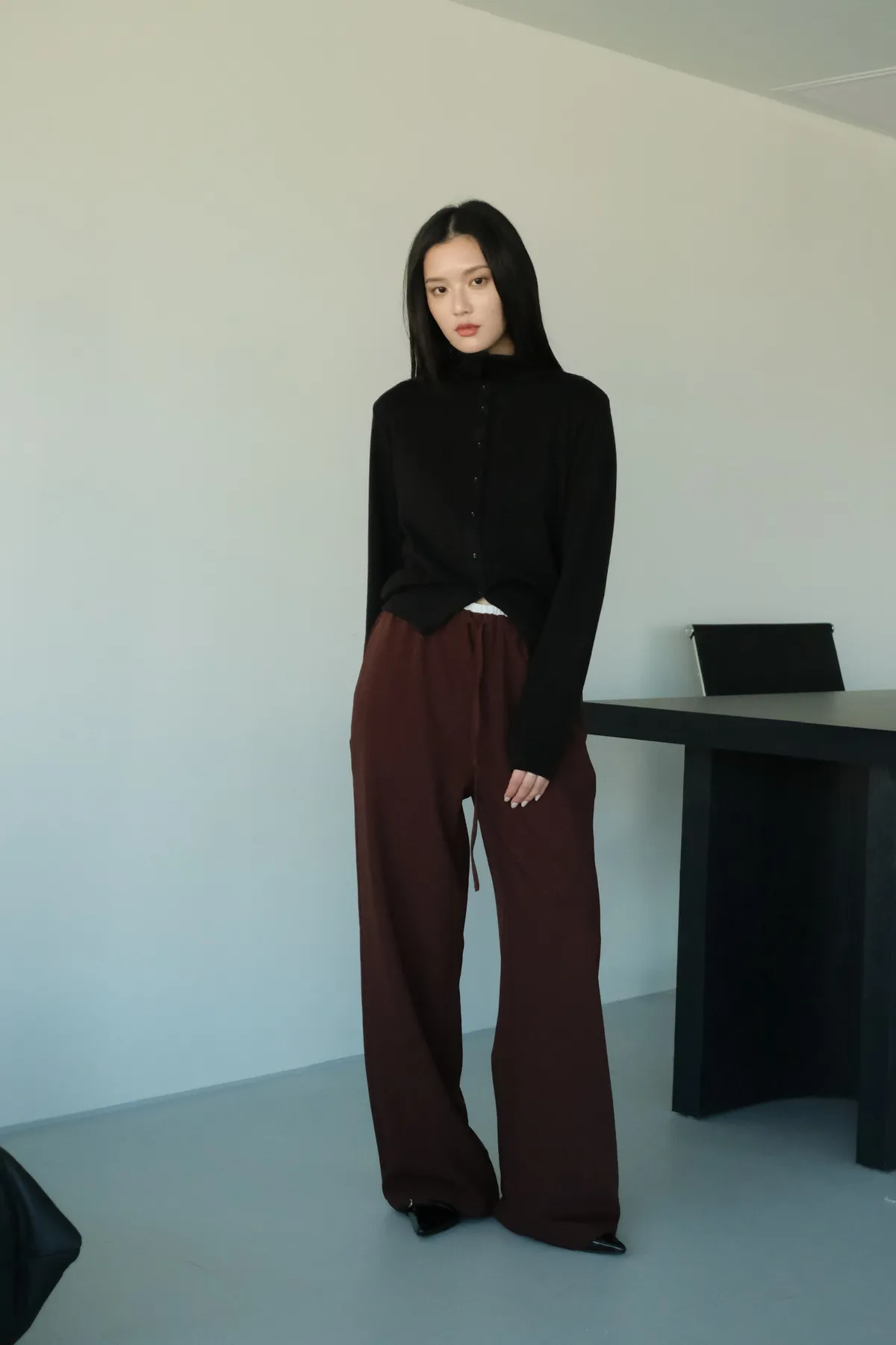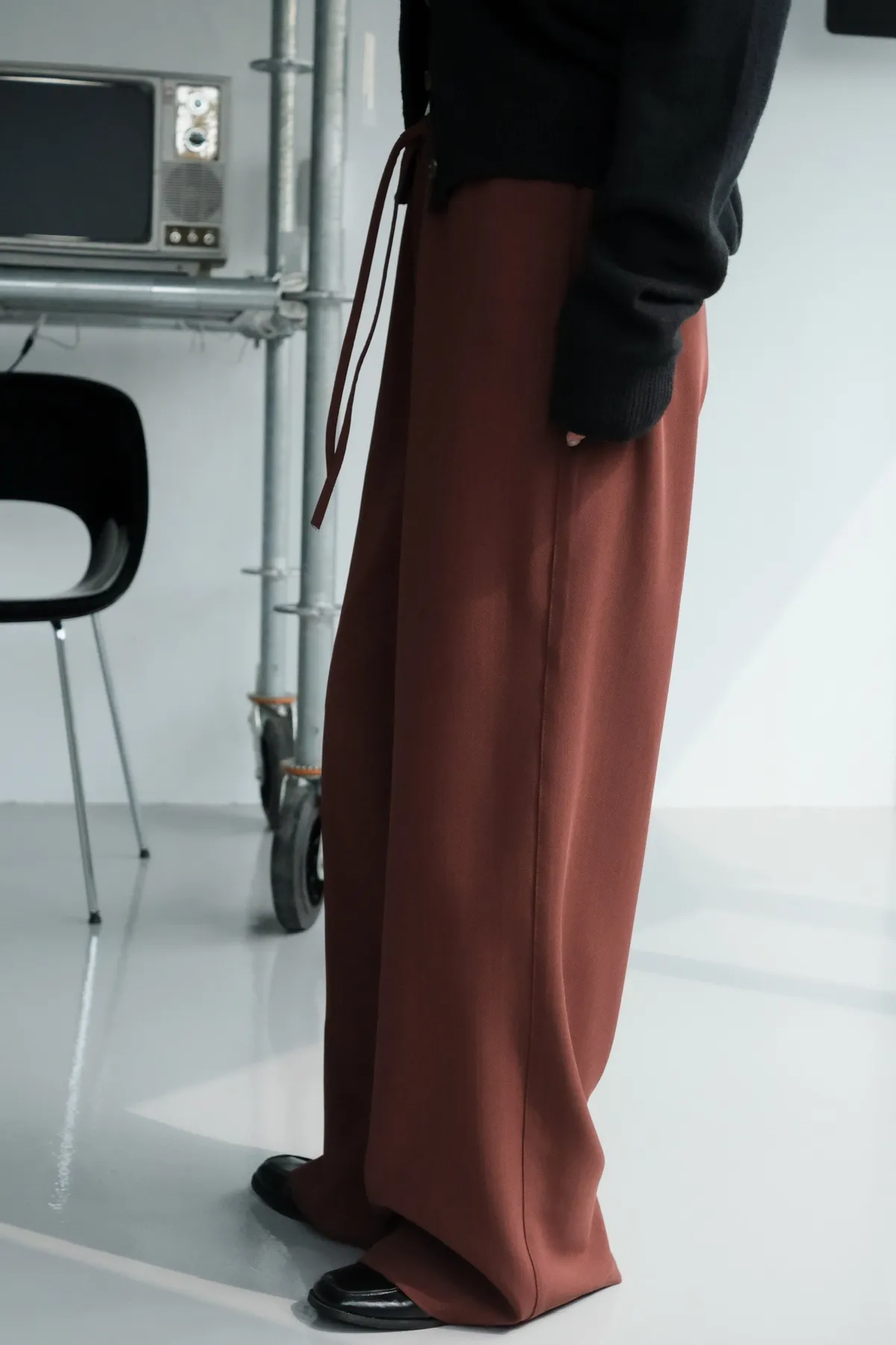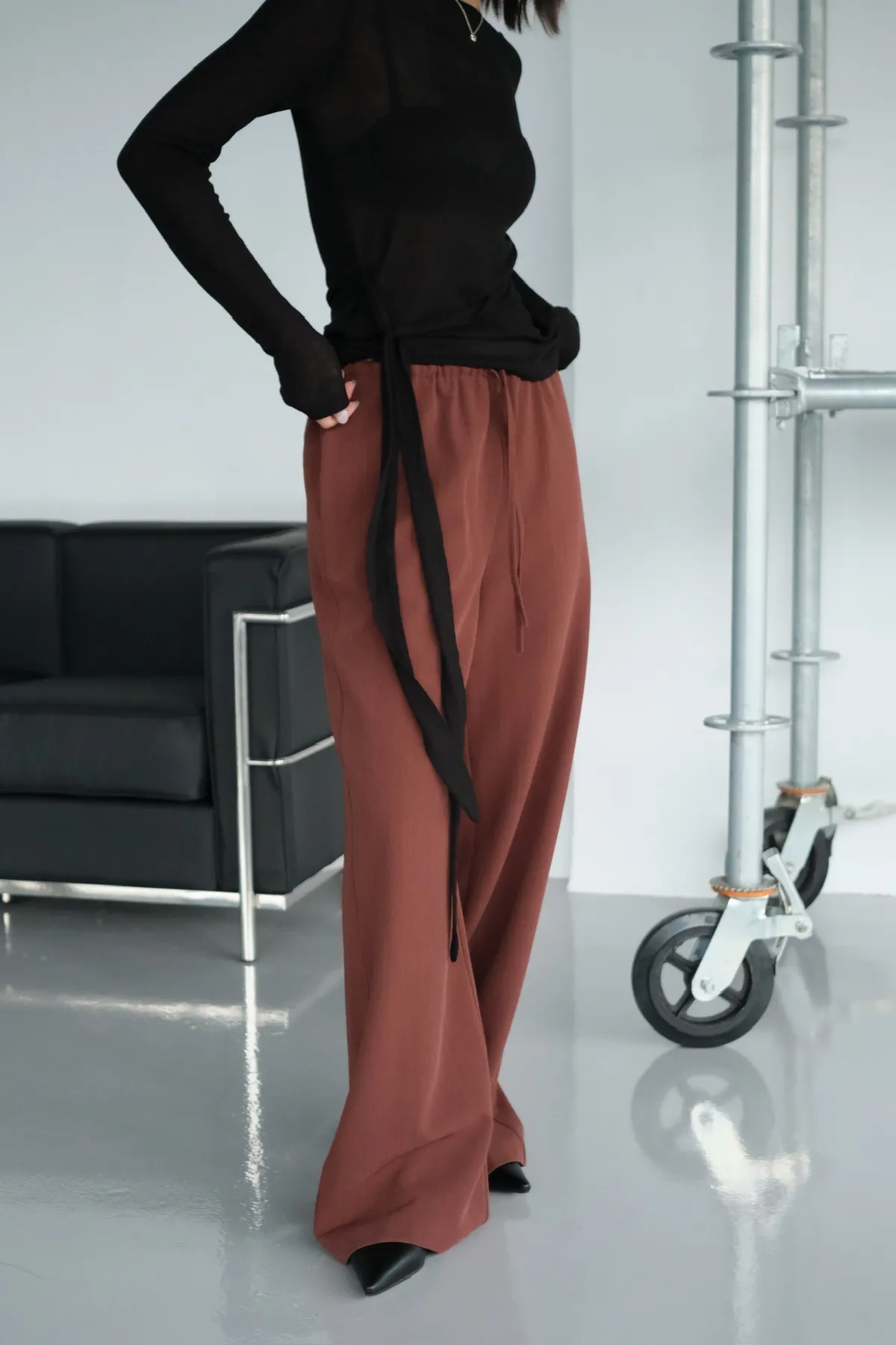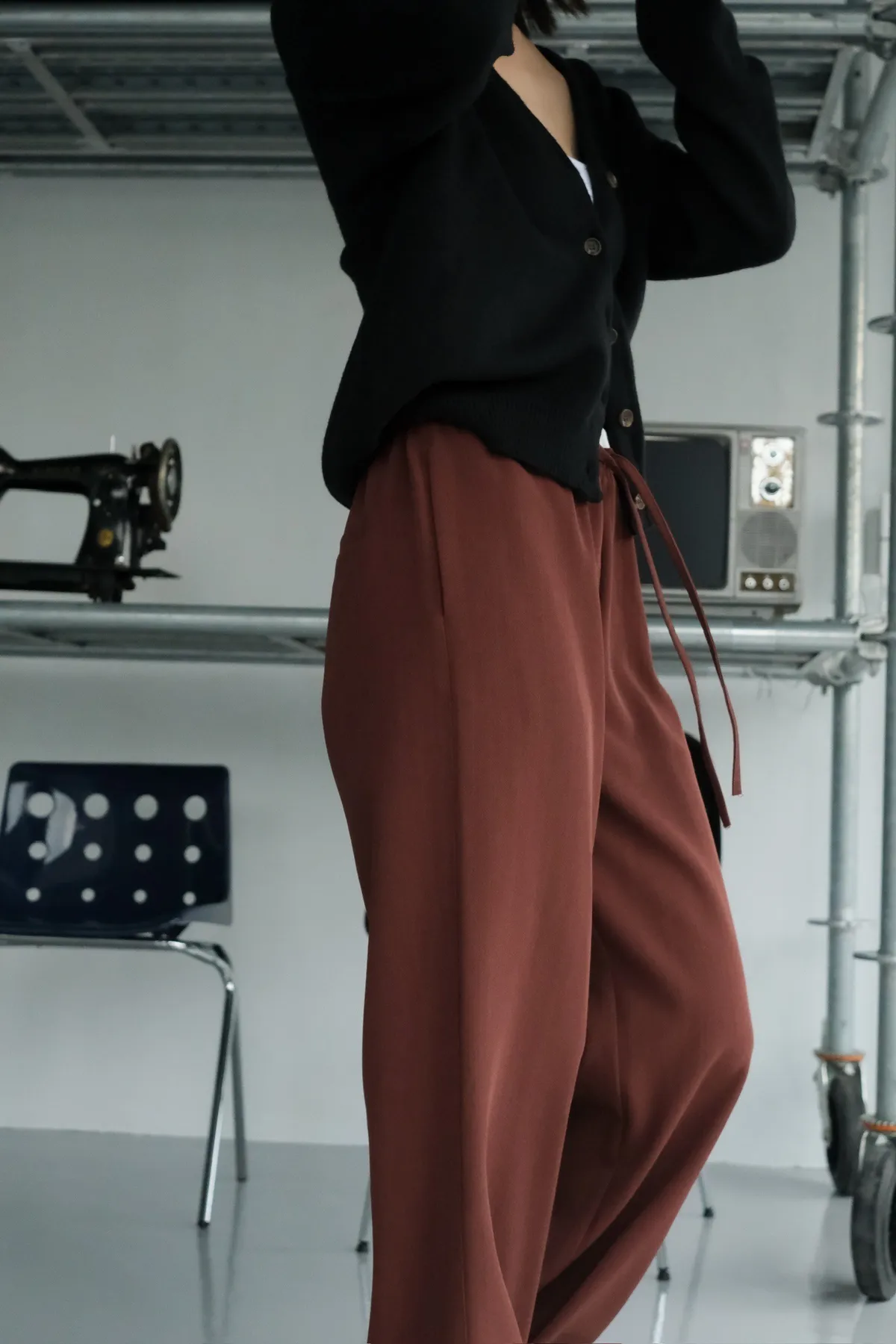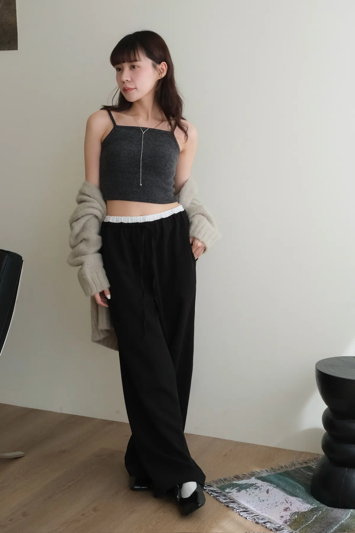 雙層褲頭搭配抽繩設計並採用西裝布面料