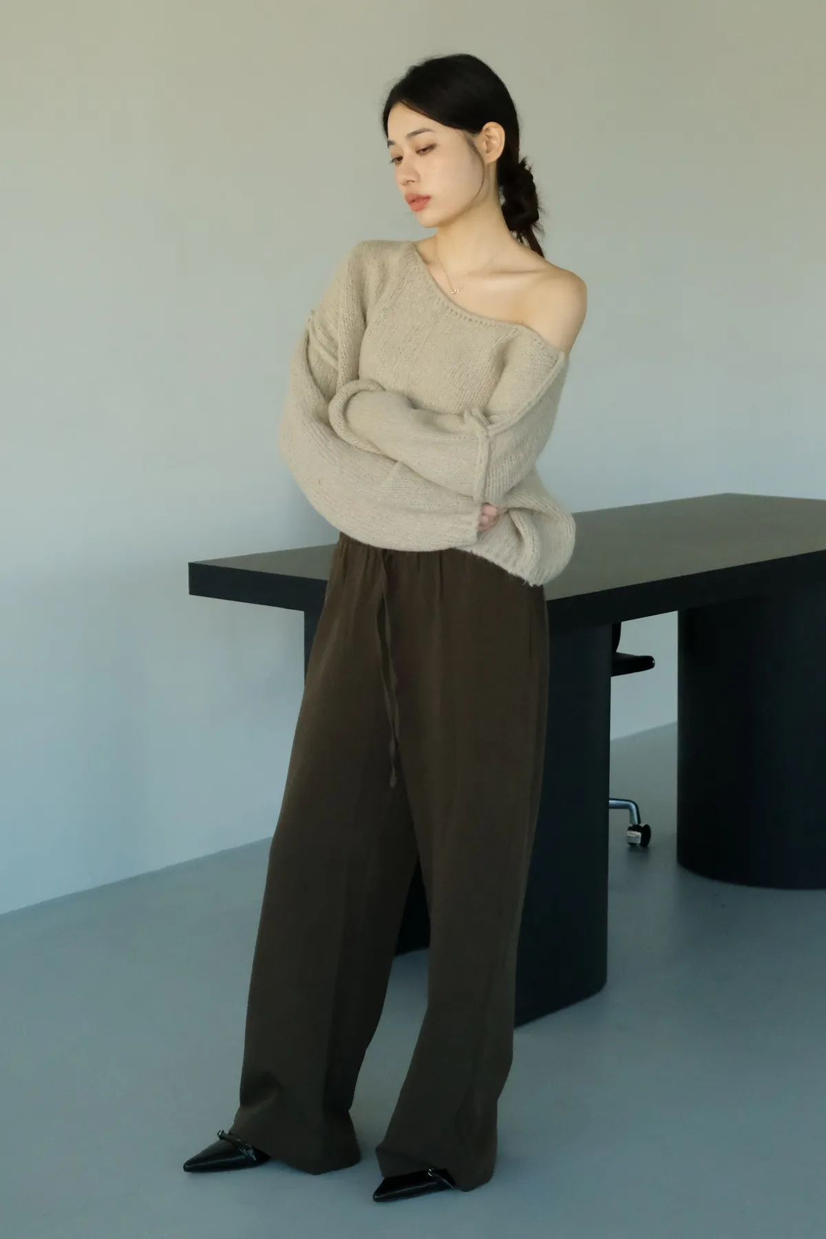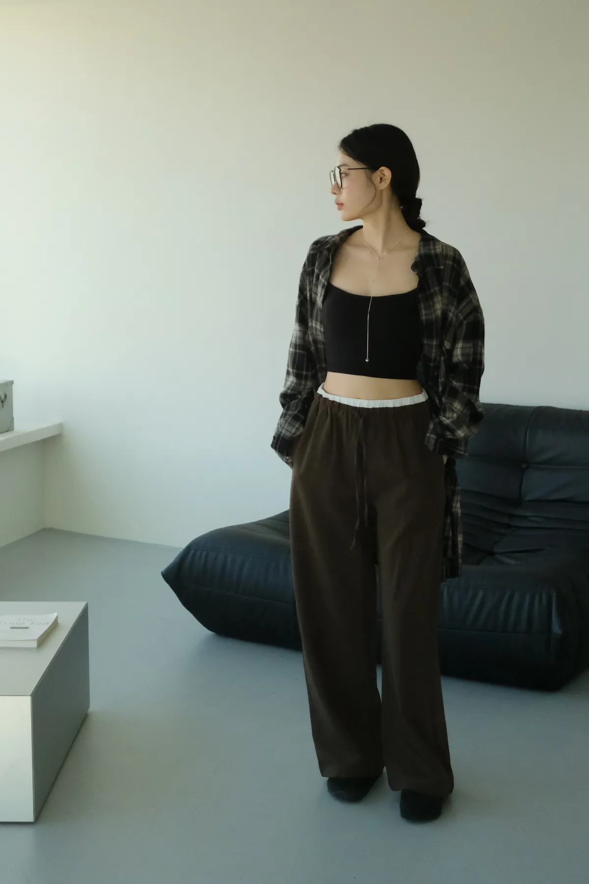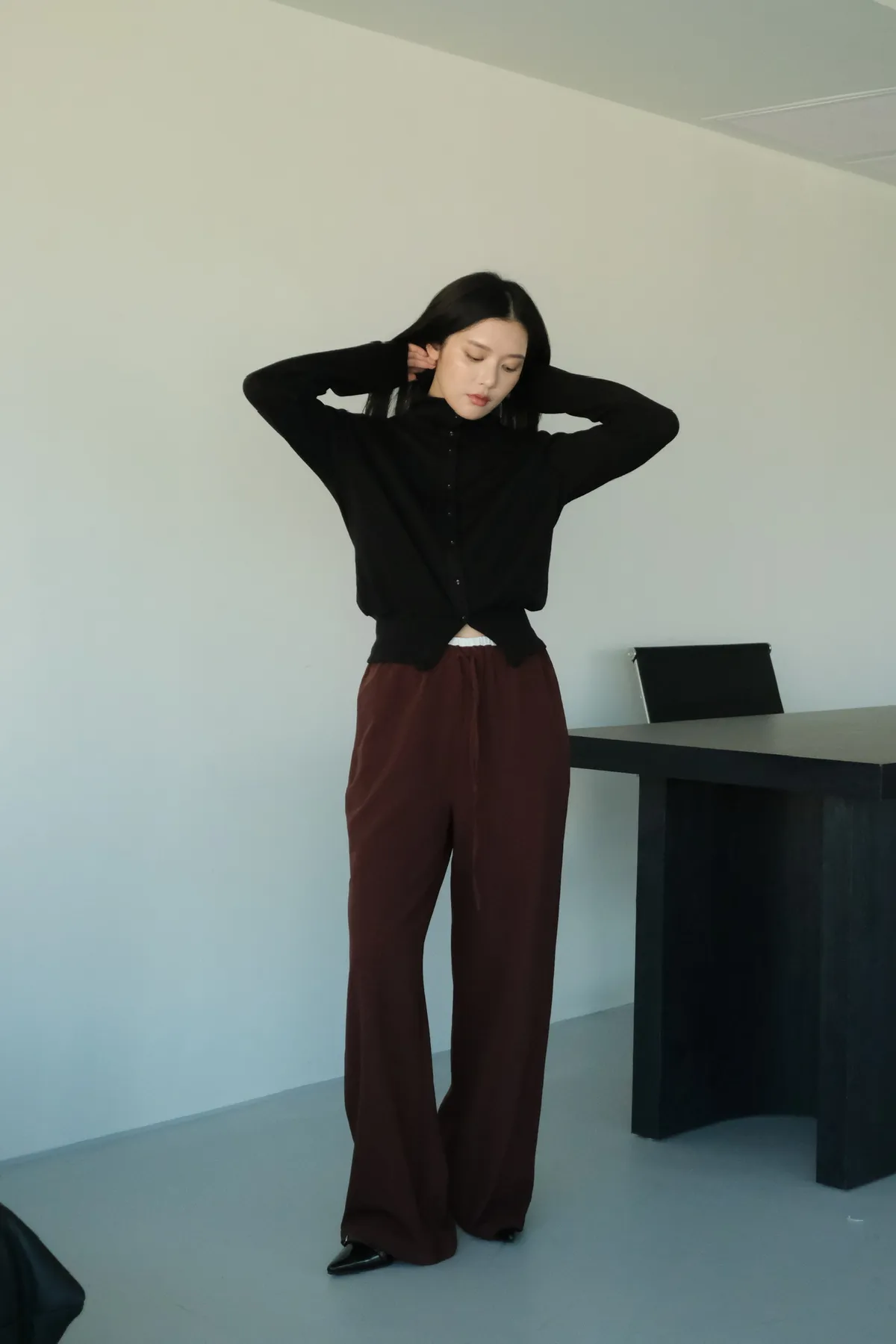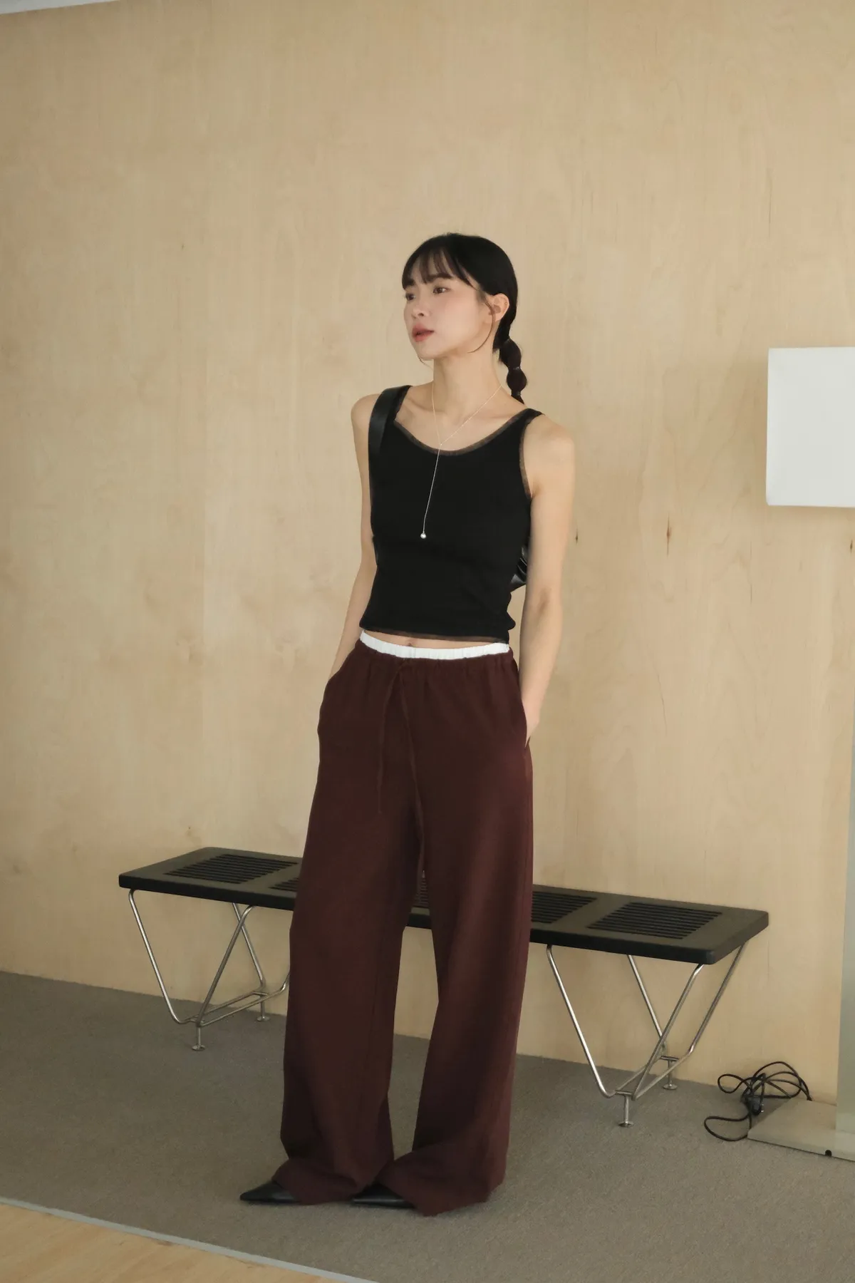 雙層褲頭搭配抽繩設計並採用西裝布面料